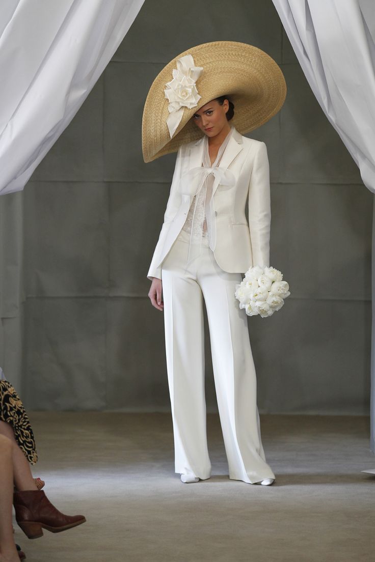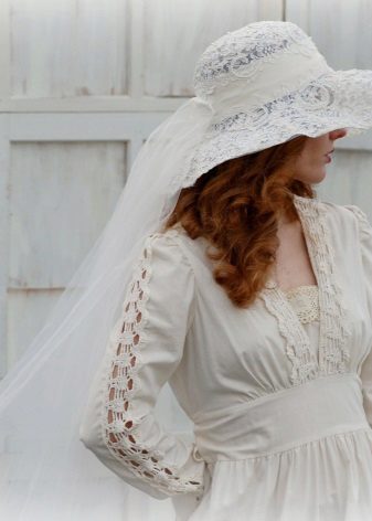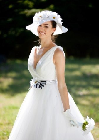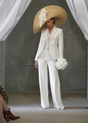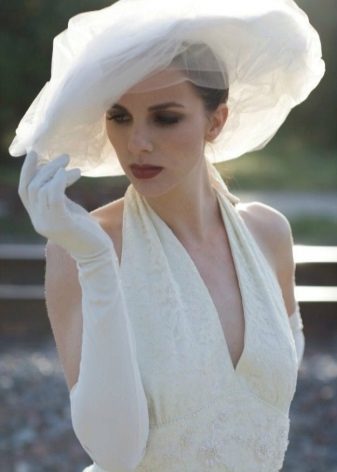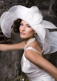 A hat with wide brim will look good with both a dress and a wedding trouser suit, which modern brides often prefer. She is advised to choose only very tall brides, and owners of small stature should prefer miniature headgear.
