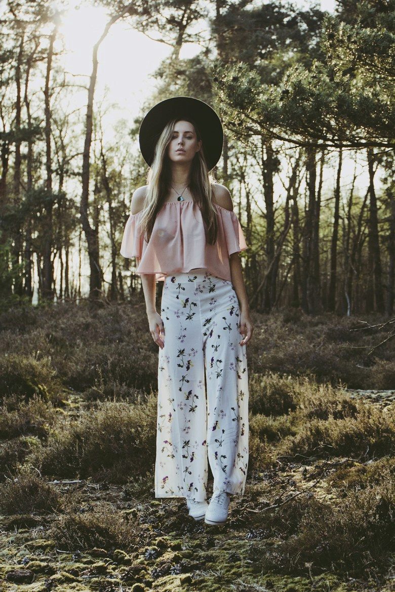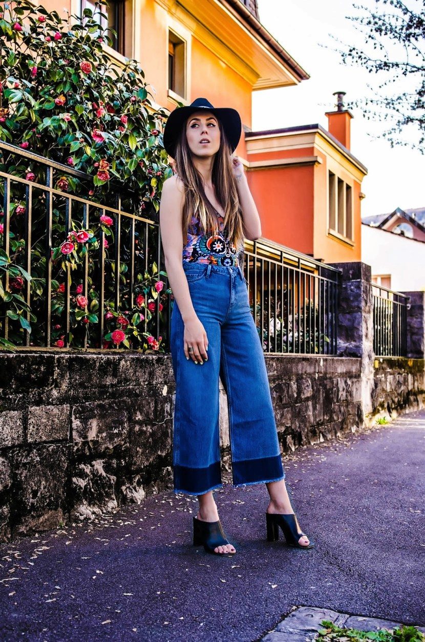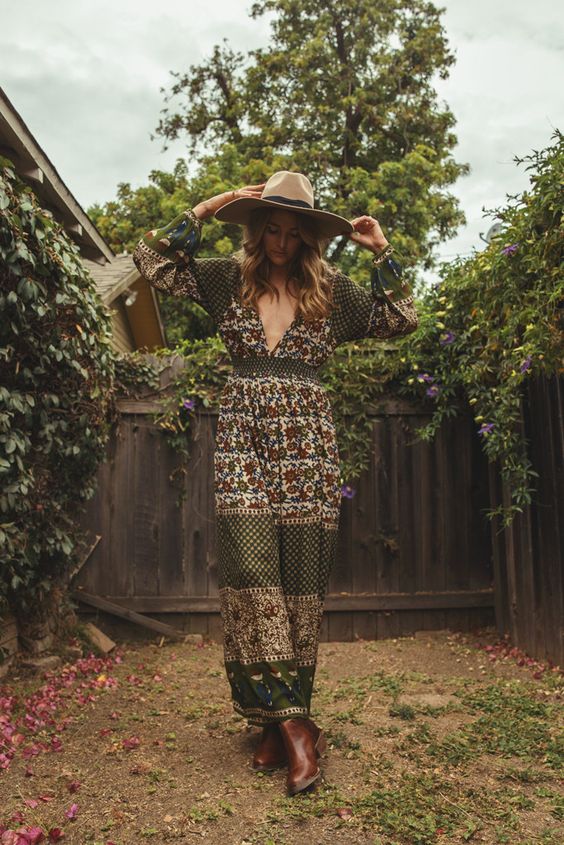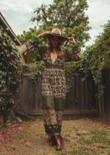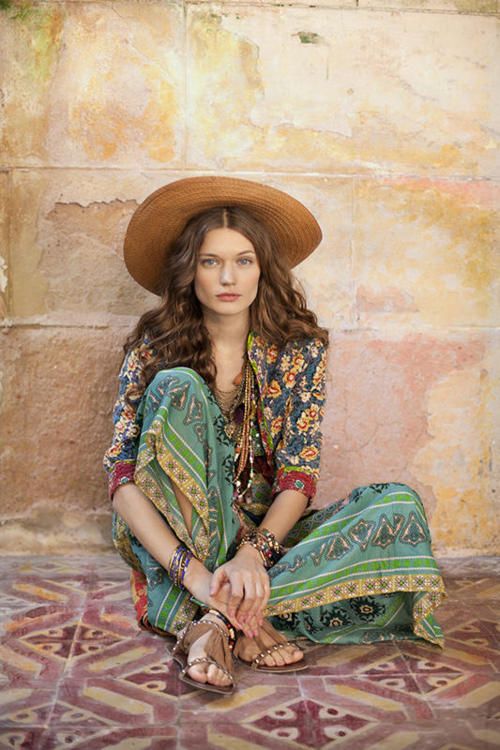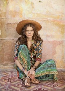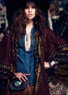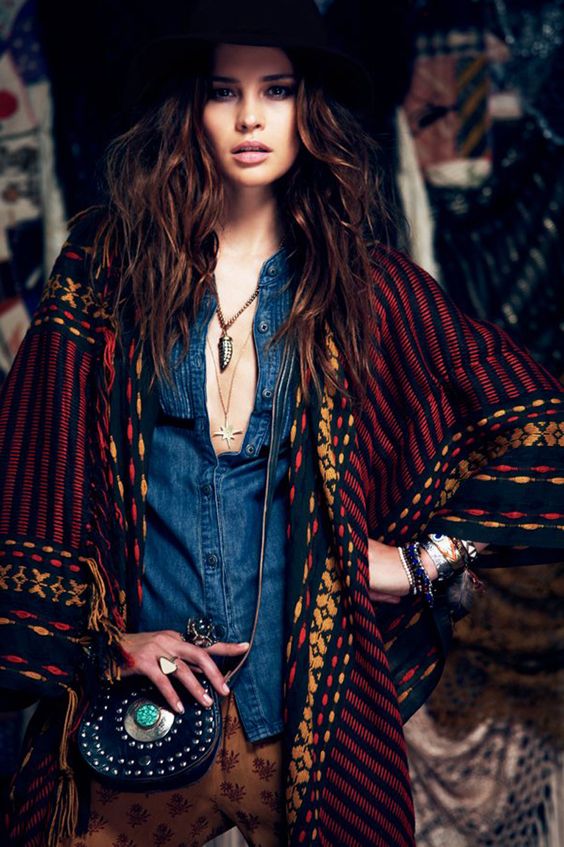 To create a boho look, wear tight jeans and a tight cropped top, throw on a colorful kimono and complement the look with a wide-brimmed hat. Sandals with a thick wooden sole are suitable as shoes.