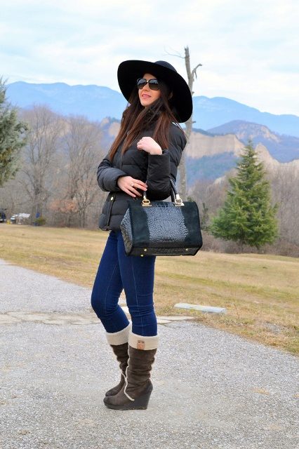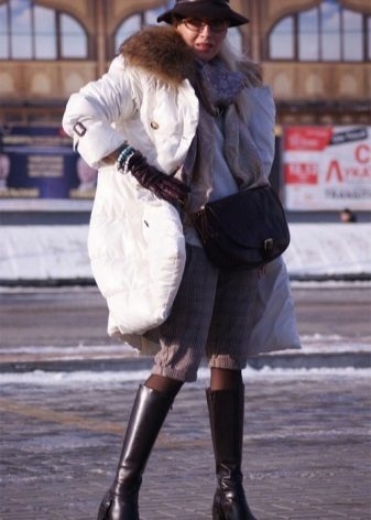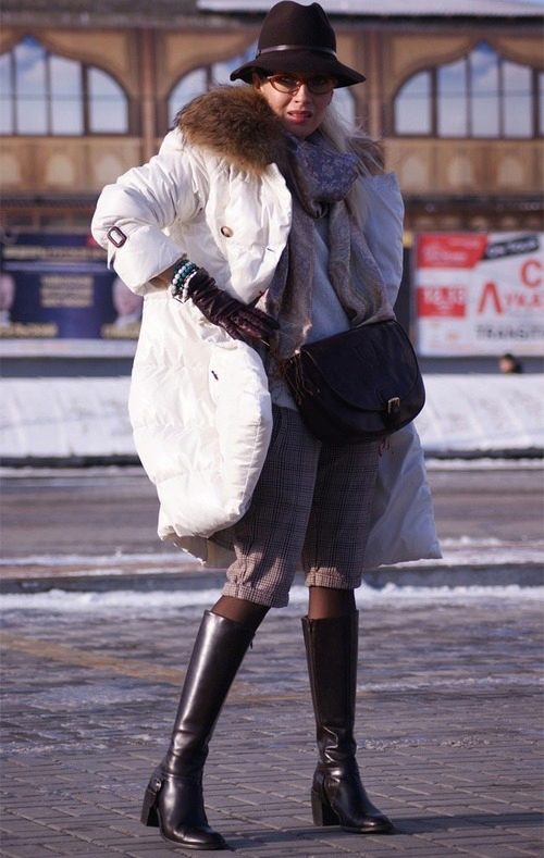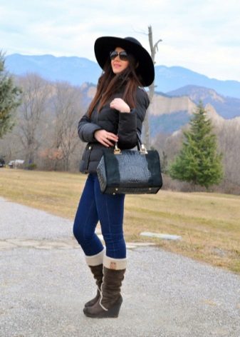 - With a down jacket. A hat with a down jacket is rather unusual, but the main thing is that the style of your outerwear looks more like a feminine coat. Forget about down jackets in a sporty style, preferring the concise and stylish forms of a fitted down coat. Complete the look with elegant boots and a small but roomy handbag.