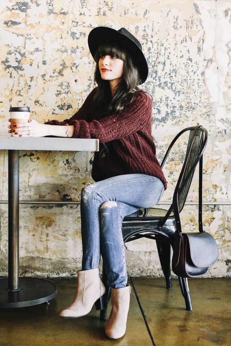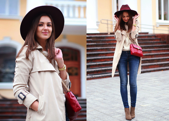 - Skinny jeans, a white jumper, suede ankle boots with heels and a cropped beige trench coat are suitable for a casual look. Complement the look wide burgundy burgundy hat and a small red handbag on a chain.