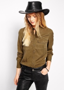 For an autumn look, you can wear a cowboy hat with black leggings or tight pants, a dark knitted blouse and a cropped leather jacket. As a shoe to this style perfectly suited boots sand sand. In combination with a short coat or jacket, the image will be expressive and stylish.