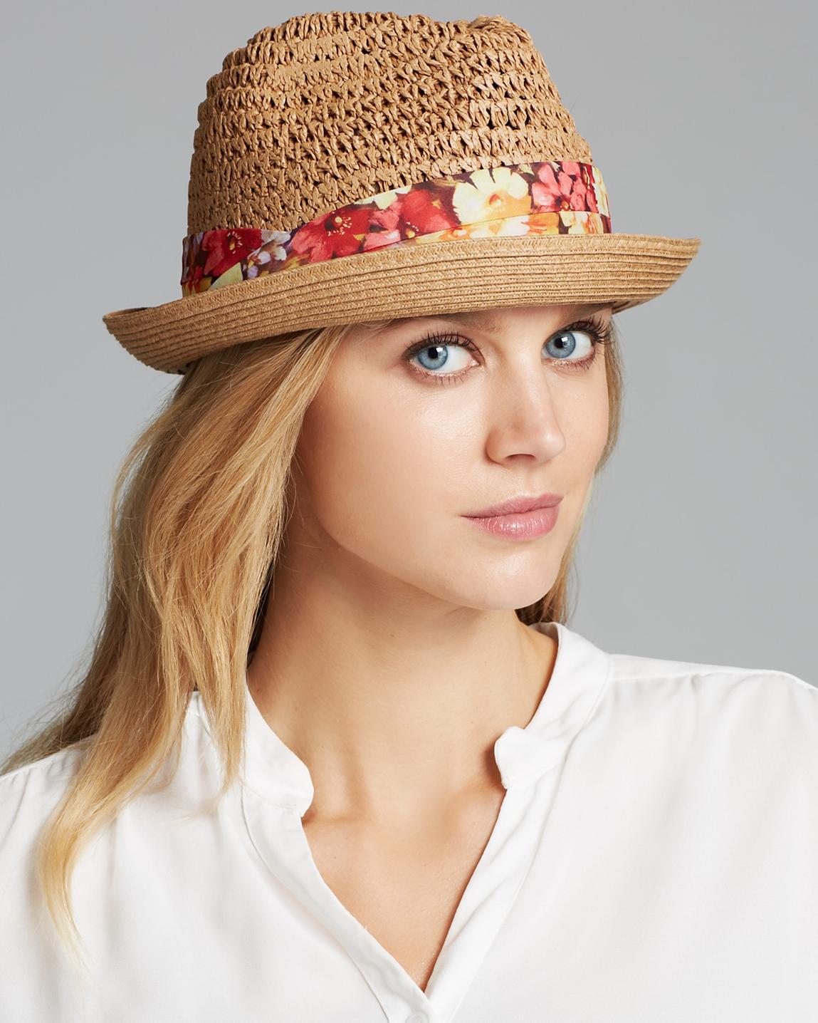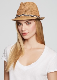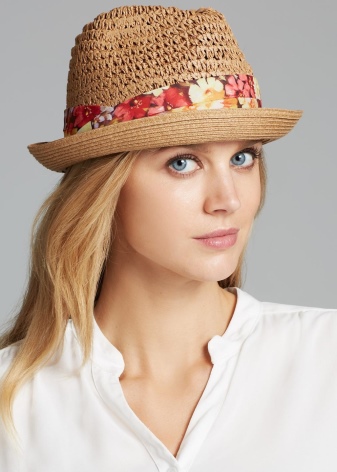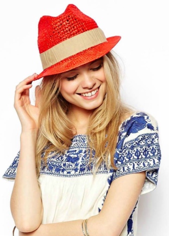 Hats with one dent are very fashionable and in demand among celebrities. Designers decorate the laconic style with a wide contrasting ribbon with an ethnic motif and a bright cord, fixed with a special buckle in front.