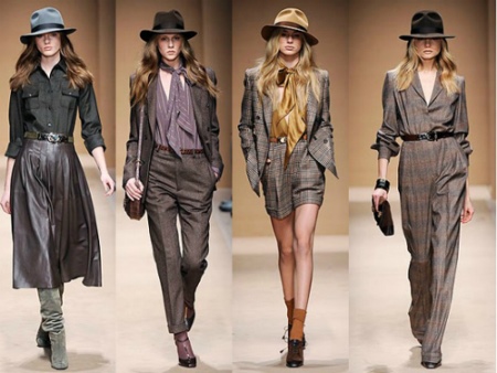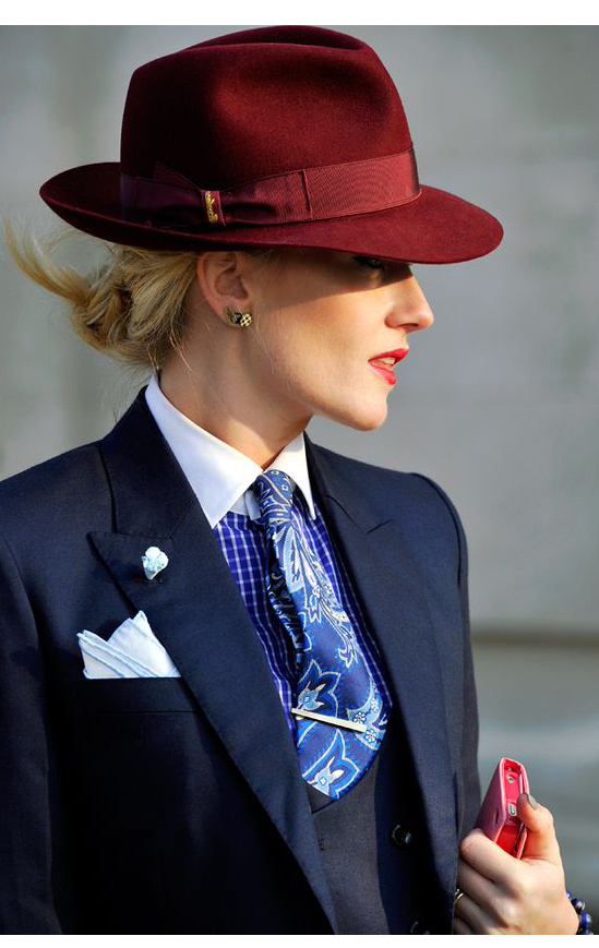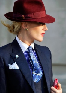 Trilby very effectively combined with a variety of trouser suits. Outfit may consist of classic trousers and jacket. Pants can have almost any cut. They can be replaced by a feminine pencil skirt. It is recommended to wear contrasting shirts and blouses under the jacket.