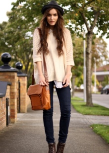 Jeans are an integral part of a stylish urban look. It is recommended to choose a model of direct or narrowed cut. Upstairs, you can wear a classic shirt, blouse, tunic or blouse with a long sleeve. Too wide jeans should be abandoned, as they will look ridiculous in combination with a feminine hat.