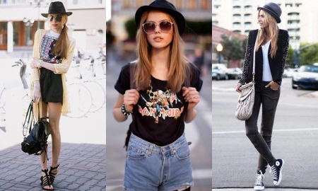 Charming hats perfectly complement feminine dresses with skirts. A thing can be of almost any length and cut. To create a bright and original look, you can choose an airy and wide skirt, a blouse of rich color, comfortable sneakers (or sneakers) and decorate with a trilby outfit.