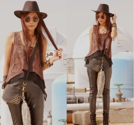Create a sexy image allow tight-fitting leggings or leggings in the classic dark colors. Upstairs you can wear an elongated shirt or tunic. Stylish outfit can be complemented by a strap on the waistline. In such a set a dark headdress will look very impressive: it can be a black or dark brown trilby.