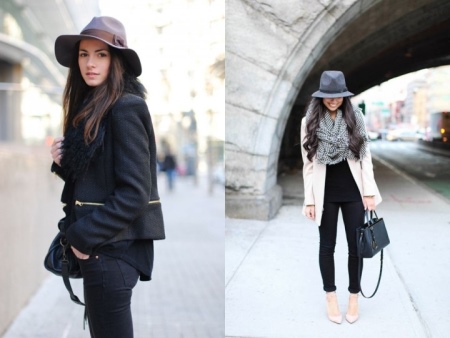No less attractive looks Fedora with leggings and jeans. If you wear a white hat with black tight pants and a snow-white tunic shirt, the image will be stylish and alive. Jeans and bows are great for casual styles. T-shirts, tops, shirts, pullovers and denim jackets will look good as the top of the ensemble.