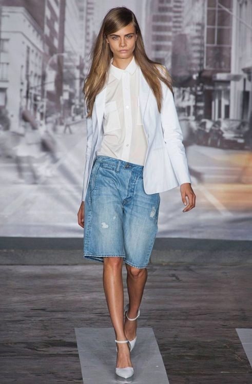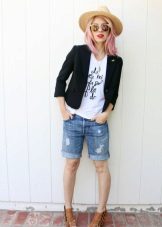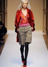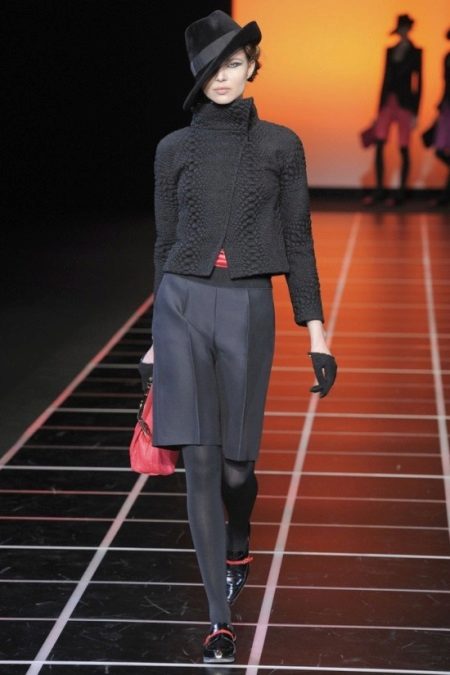 An example of the autumn or winter version of wearing Bermuda shows a girl on the podium. Black shorts just above the knee are complemented by dark tights, boots and a jacket. Accessories complete the stylish look: a hat adds drama, cropped gloves reveal fragile wrists. Perhaps this kind of not quite suitable for Russian frosts, but after playing with the details, any woman can adapt it for themselves.