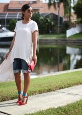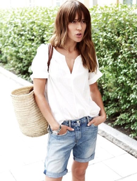 The girl shows us a casual summer look, created with the help of denim tucked shorts and a light white blouse-shirt with short sleeves. Complements his wicker bag. One of the simplest in execution, but because no less spectacular look.