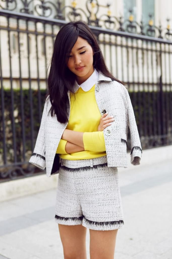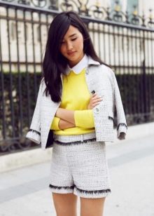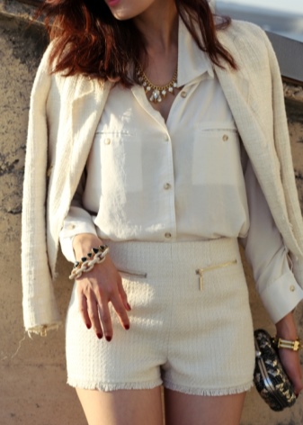 Popular and tweed shorts, suitable for a cooler season. But most often the model from this material is not used as an independent element, but comes bundled with a stylish shortened tweed jacket.