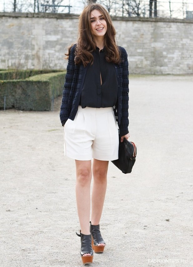 Knee-length shorts can also be very well combined with all of the above items, but they look most harmonious with a classic white cotton fabric shirt. This outfit will be suitable for any office dress code.