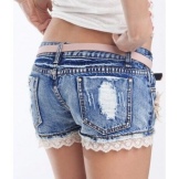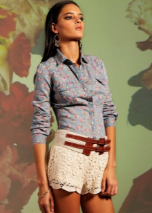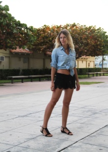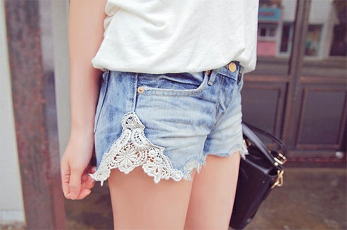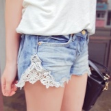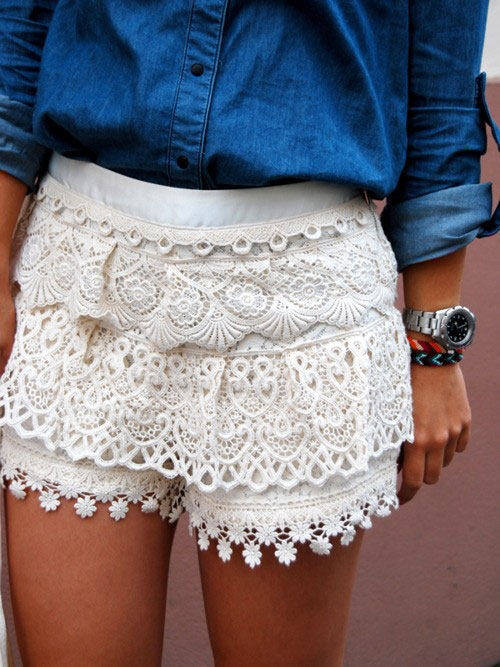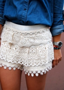 In addition to fully laced models, there are shorts, only partially decorated with lace. One of the most popular is denim shorts. White or light lace looks very beautiful against a denim background.