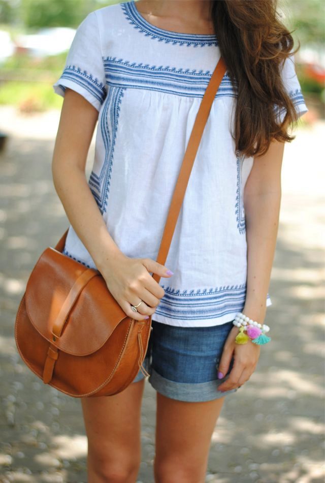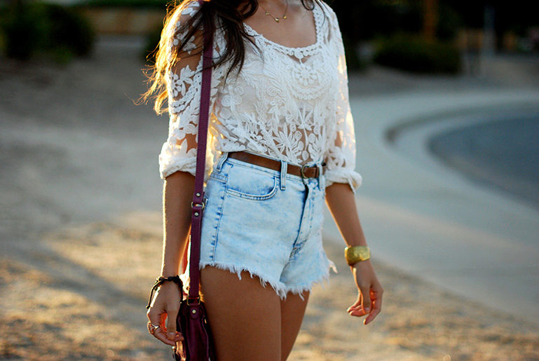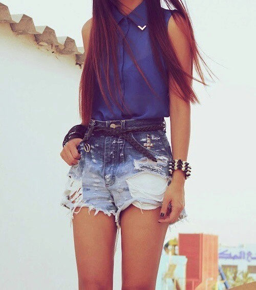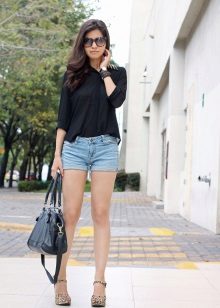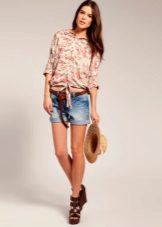 - Very lacy looks lace translucent blouse in oversized style, combined with denim light blue shorts. It is better to choose a model of shorts with a high waist in order to tuck the blouse inwards and complement the image with a narrow brown strap, and the fringe will give the product a slightly hooligan look. Complement the image with a crimson-colored bag and sandals on a wide heel to match, as well as cowboy-style accessories and your look will be unmatched and inimitable.