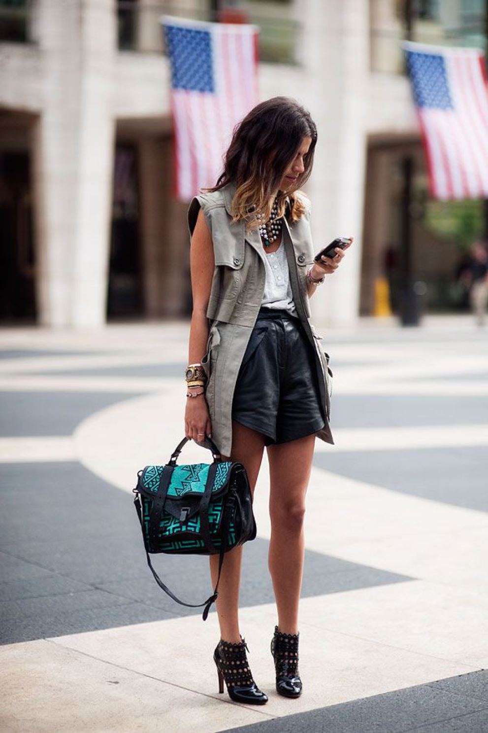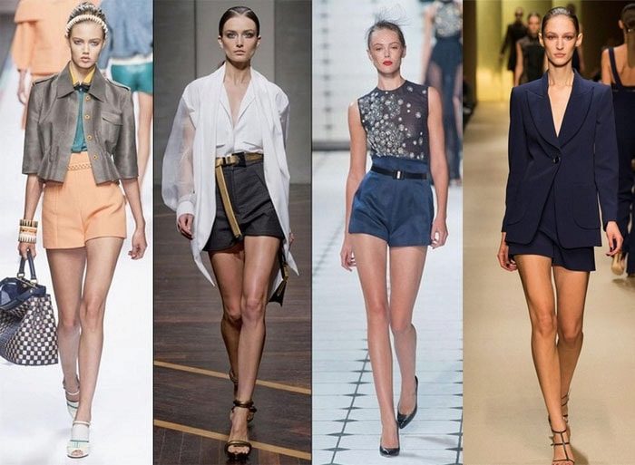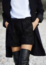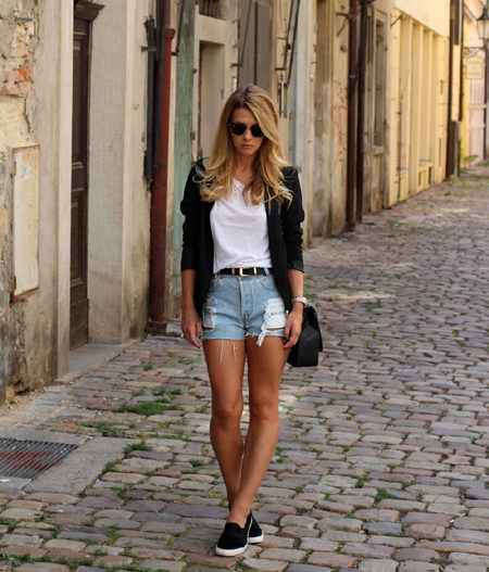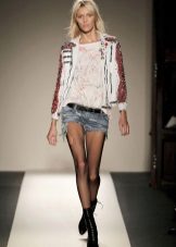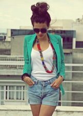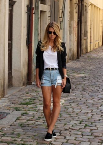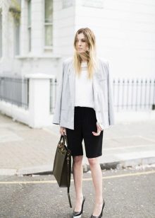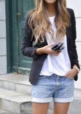 - First, the shorts are perfectly combined with various types of jackets, jackets, blazers. Such an unusual combination will help to create a very interesting image, because the elements of a business style are always well combined with things in casual style.