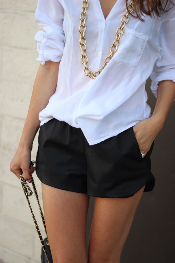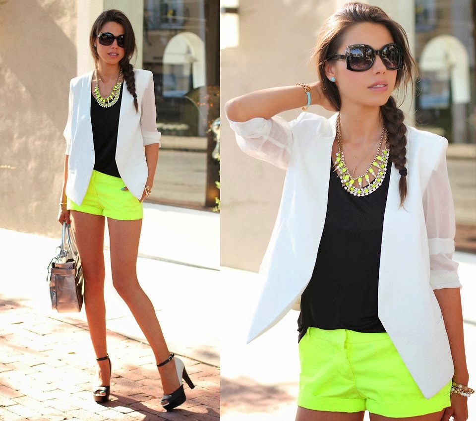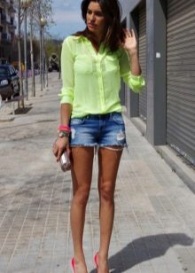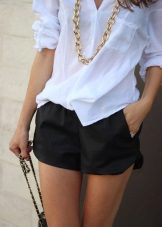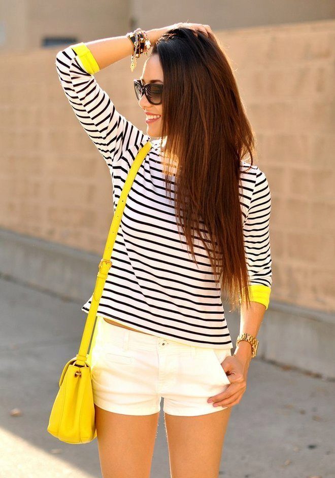 - Absolutely incredible, incredibly stylish and bright image can be created with light cotton shorts of bright yellow color. Such a tone will in itself look spectacular and stand out, so the rest of things should be chosen in a more restrained style. A black loose top, a white jacket with chiffon sleeves, stylish black and white shoes with an open toe are perfect. As accessories and additional items, you should choose a silver bag, a large necklace with bright yellow and silver stones, as well as thin blue bracelets.