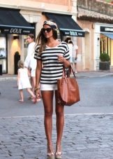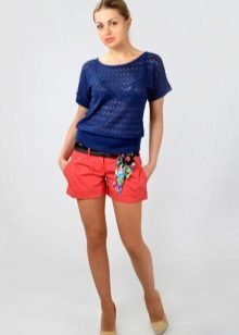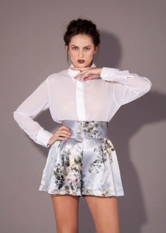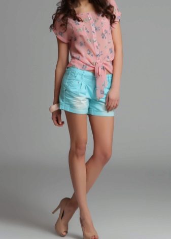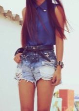 - A lightweight airy look, suitable for hot summer days, is obtained if you combine the blue shorts of a free cut with a high waist and a light chiffon oversized shirt. It is better to leave a pair of top buttons on the shirt open, and fill the product itself into shorts, complementing the combination with a thin woven dark brown strap. In addition, sabot sandals and a bag in tune with the belt are perfect. As for accessories, a colorful necklace made of small beads, a large ring with a blue stone in a gold-cut, and a small golden watch are just what you need.