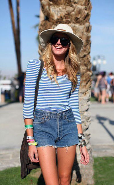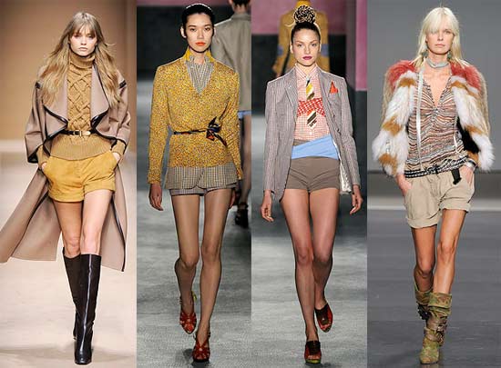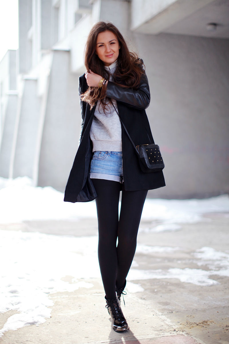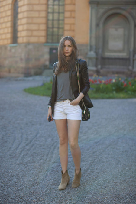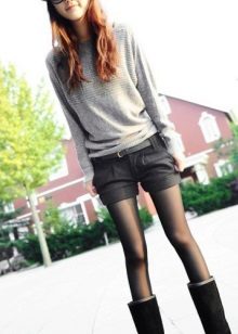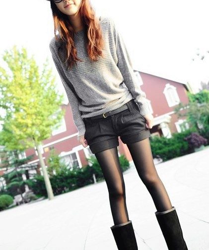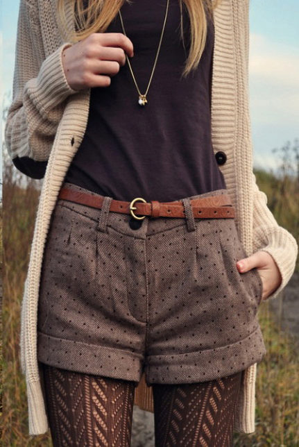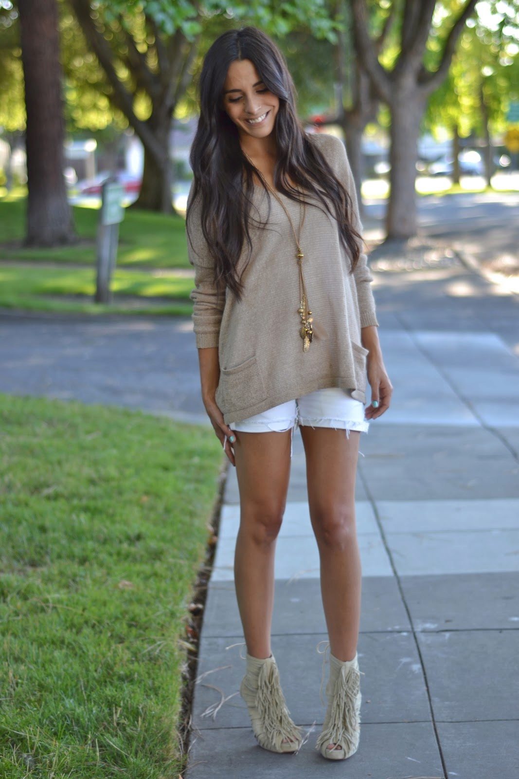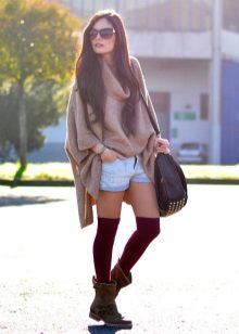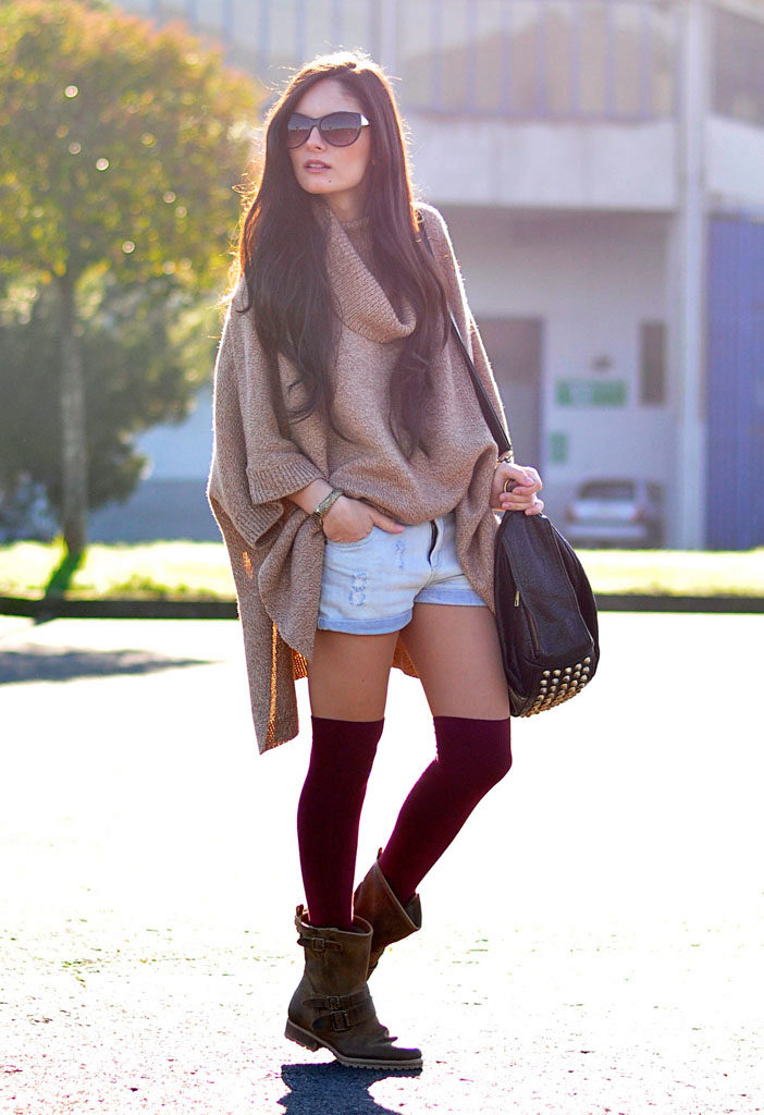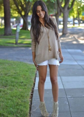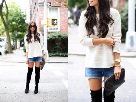 - An outfit suitable for cooler weather can be obtained if you take denim, not too short, shorts with a fringe, a loose sweater of a milky color and add this combination to high suede boots with a flat sole. Stylish golden accessories on the hand, black rectangular clutch and sunglasses will give along the light notes of gloss, and smooth wavy curls create a feeling of lightness and freedom.