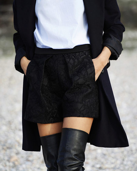 High-waisted shorts help emphasize slim fit and emphasize a stately silhouette.