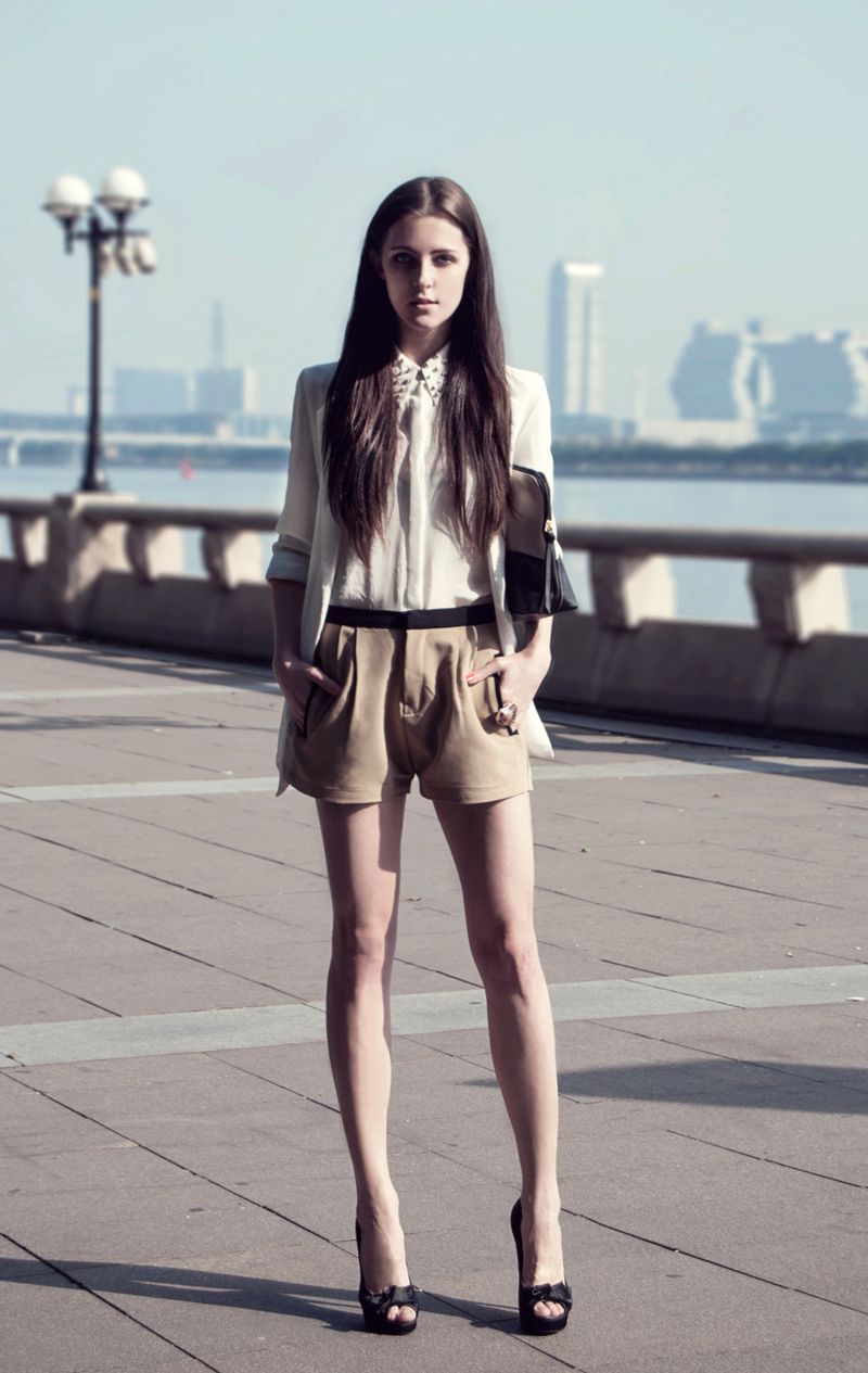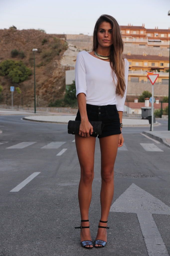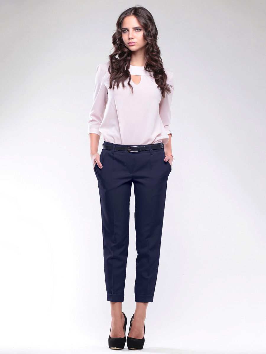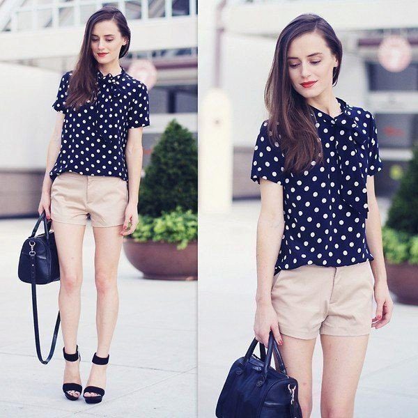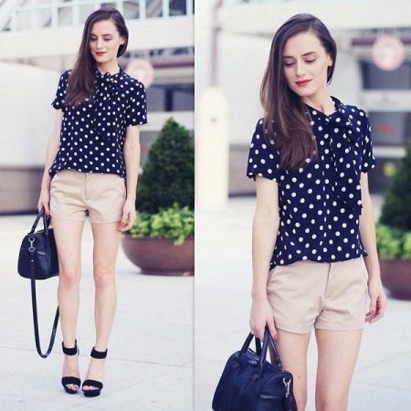 - An image characterized by restraint and elegance, combines classic flesh-colored shorts and a dark blue blouse with a short sleeve. Black sandals with high heels and a bag to match - the perfect complement to the outfit, which is quite suitable even for a business meeting in the hot season.