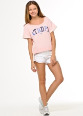 Simple-cut cotton shorts will look great for a sleeveless tunic made of lightweight fabrics in delicate shades of pink, yellow, lilac, or green. Also, translucent T-shirts of a free cut of this style, which assumes an open shoulder or clavicle, will look good over such a short model.