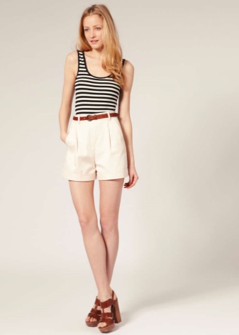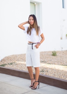In this case, the style of white shorts should be able to skillfully combine femininity with conservatism. Most often in classic style there are women's shorts with a high waist. They must be equipped with a narrow leather belt with a classic buckle. Their length can vary from mid-thigh to the beginning of the line of the knees. The cut can be straight or slightly narrowed down.