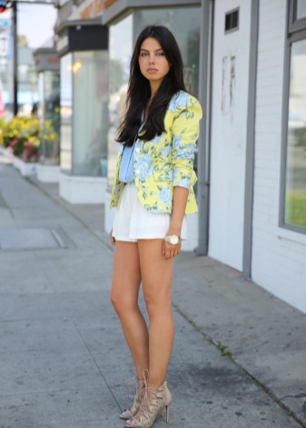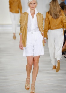 Stylists recommend combining white shorts with shirts or turtlenecks in neutral colors such as gray, gray blue, black, milky, pale yellow, or beige. However, this style allows you to add shorts and more solemn, but always monochromatic blouses of their silk or satin.From above you can put on a vest or a strict jacket of direct cut.