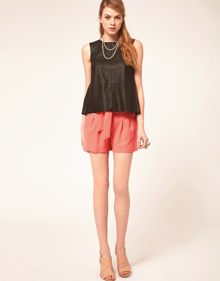 Comfortable leather shorts with elastic will suit the owners of the perfect figure. If there are problems with the waist, the elongated top will be the right choice.