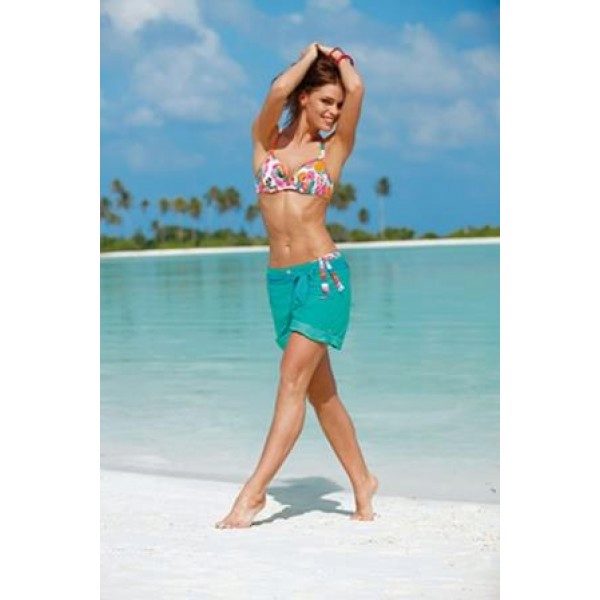 - A special option is swimming shorts. Convenient for dynamic girls actively involved in beach games (for example, beach volleyball). Made of thin quick-drying fabric, they are complemented by pockets, lacing or elastic waistband. Swim shorts can be part of a sports swimsuit, complemented by a tank top, which can be short or long (tunic). This is a feminine option, suitable for ladies prone to sunburn. The latest seasons in the trend of the retro-style model are high-rise shorts and a cropped top (by the way, a winning solution for obese women: excessive melts smooth out excessive roundness of the hips and protruding belly, and the upper part focuses attention on the lush chest).