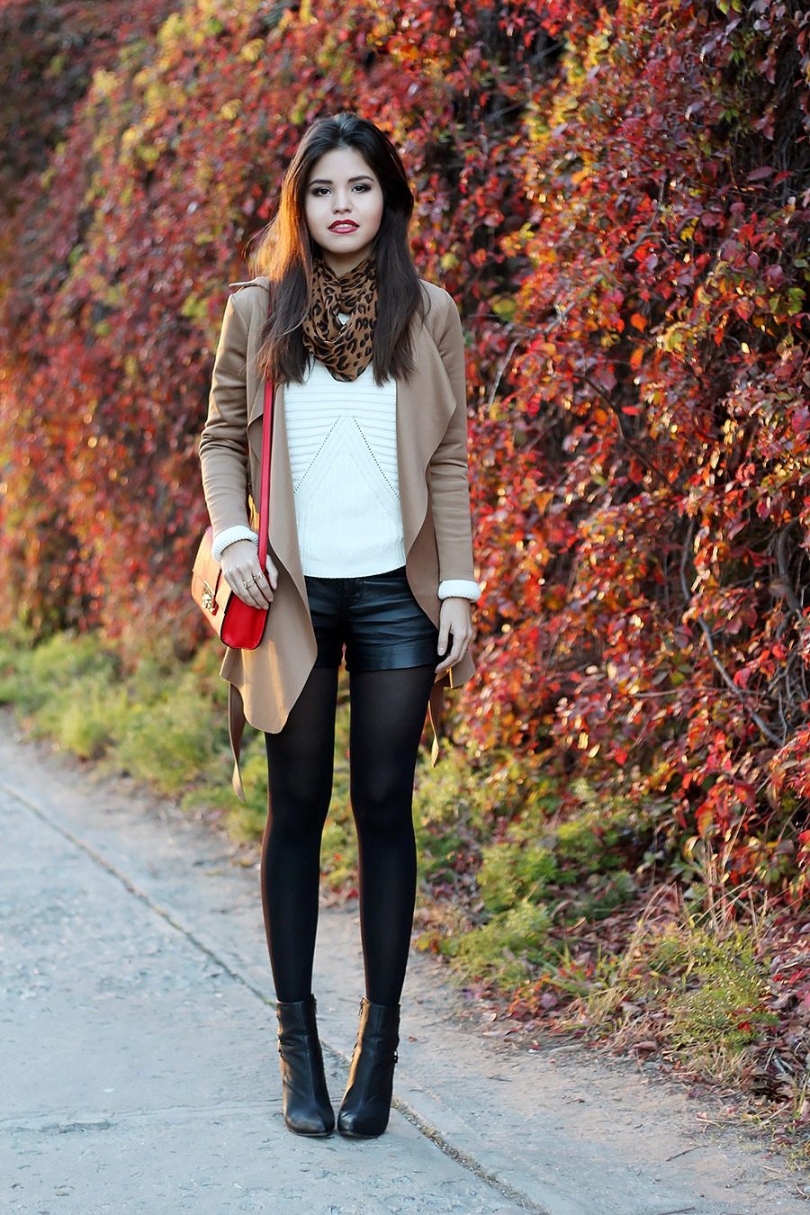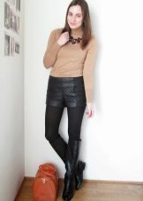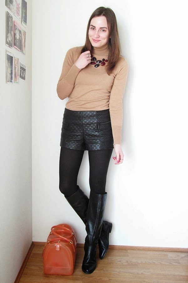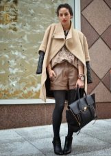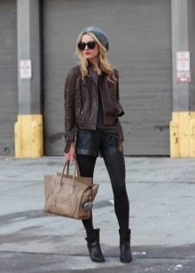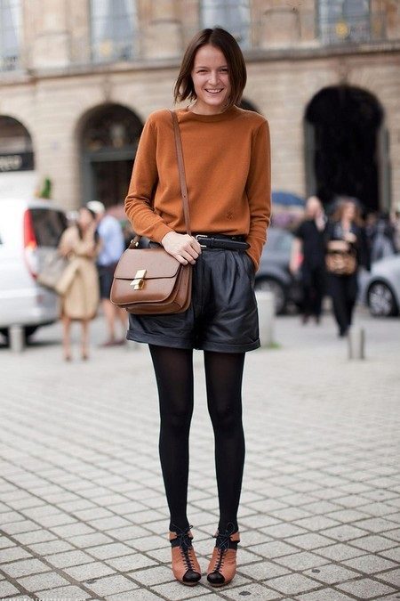 - In the fall, wear loose leather shorts with tight black tights. Complete the look with a terracotta jumper, open-toed booties and a brown bag with a long strap. This image is suitable for everyday wear, meeting with friends or even for work, if you do not have a strict dress code.