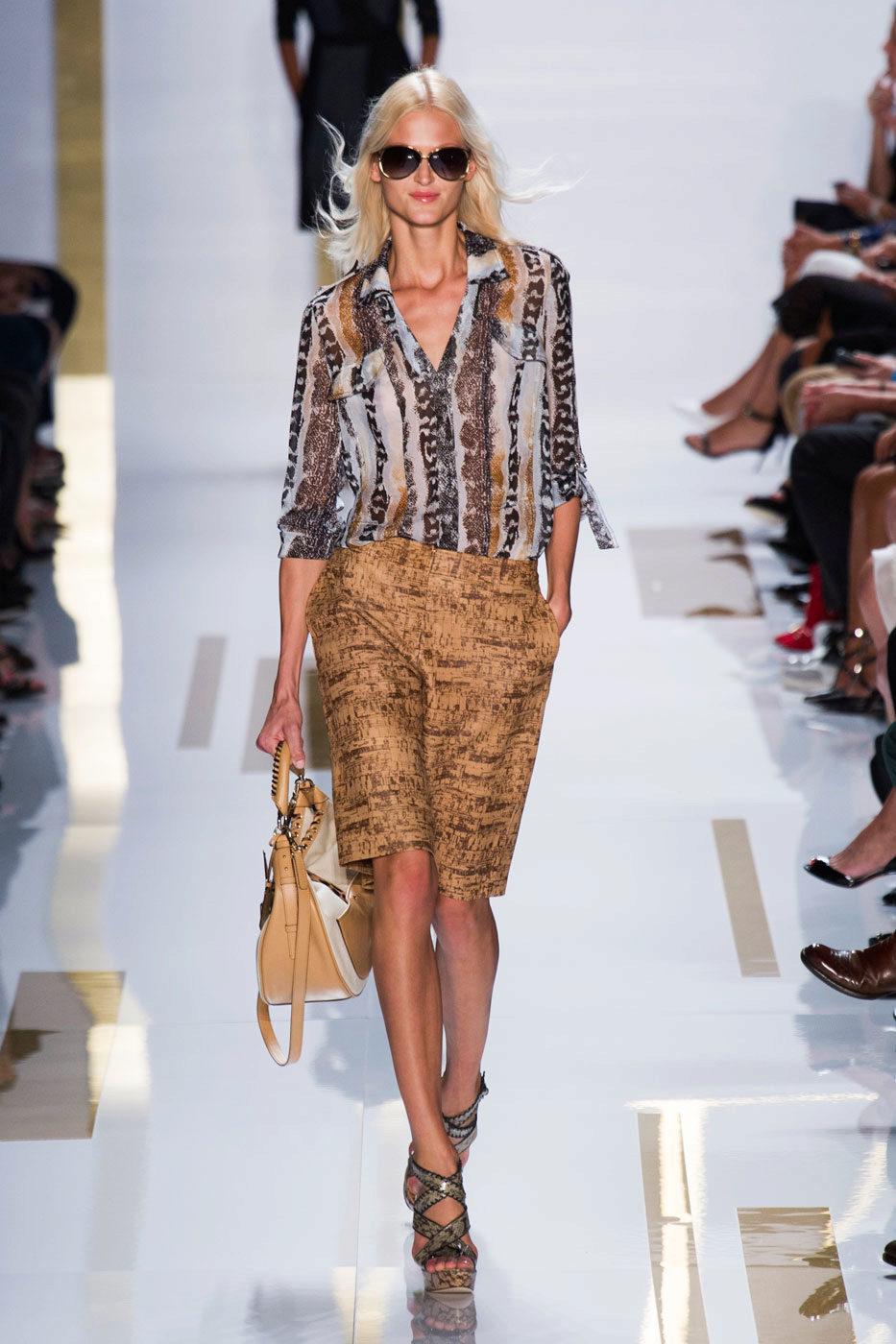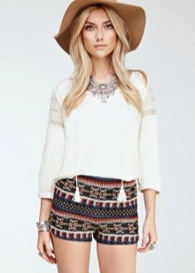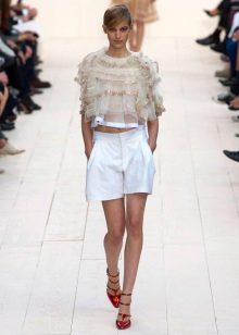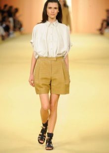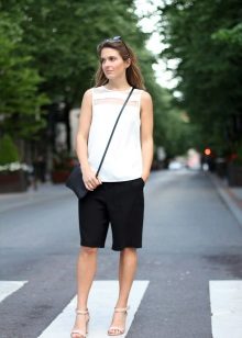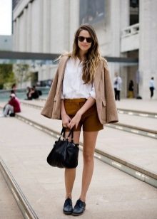 To work you can wear shorts with a blouse or a thin shirt. It can be bright and calm, but a white model is always a win-win. Do not forget to add such an image with accessories and stylish boats.