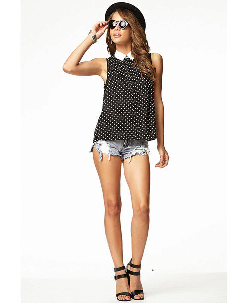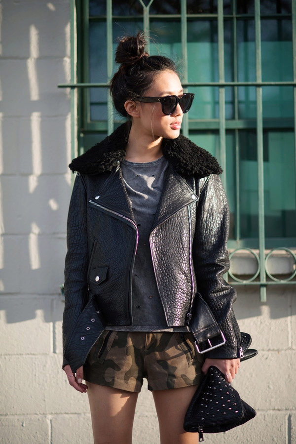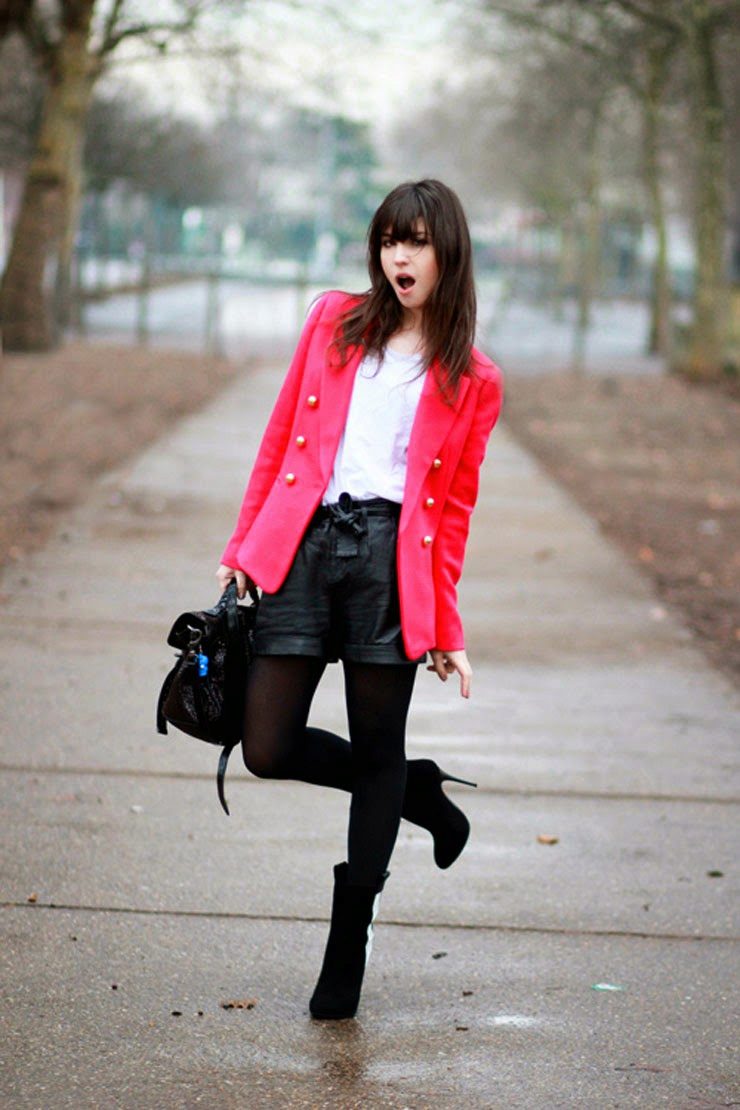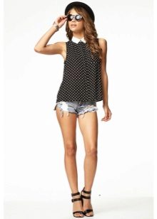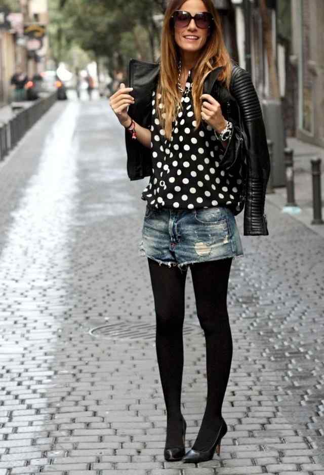 - A stylish combination of denim shorts, black blouse and leather jacket. Look complemented by black narrow-toed shoes that visually lengthen the leg. A good image for shopping, cocktail with friends and a fashionable party.