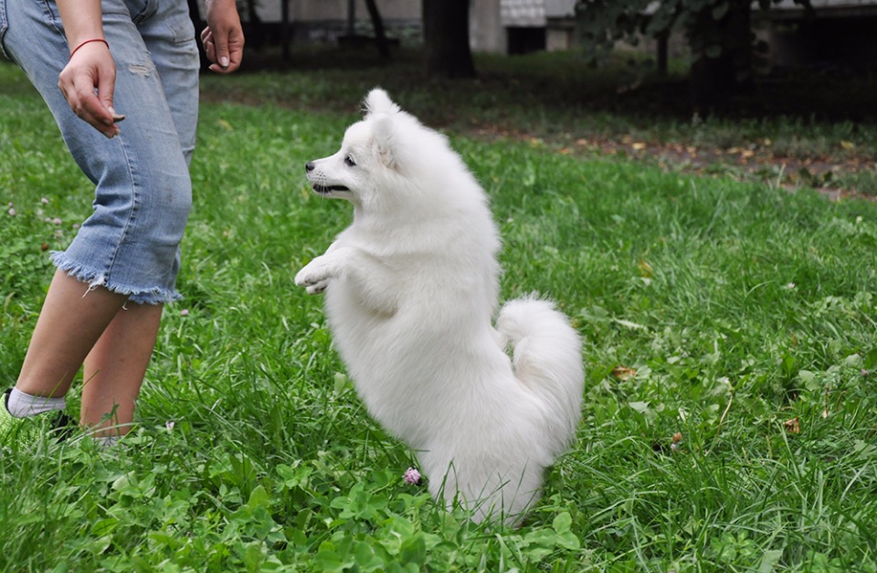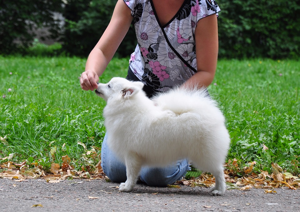 White spitz can easily carry out any command of its owner. However, for this they need to be trained. It’s best to start doing this from an early age so that the spitz can quickly get used to its owner. To do this, you have to independently not only feed him, but also give him water, arrange joint walks, play.