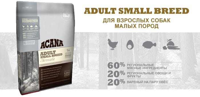 - Acana Adult Small Breed - holistic, which contains 60% of animal proteins. Carbohydrates of fast type are presented in the form of algae, alfalfa, cranberries. This composition allows you to maintain an optimal weight of the pet.