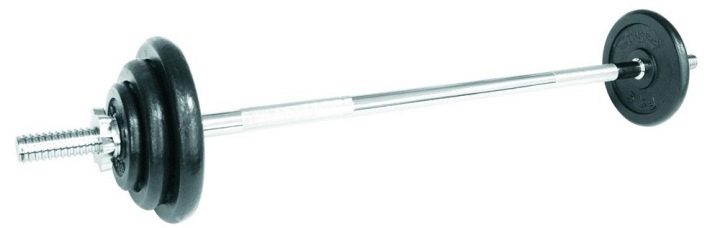 Vultures are made from non-corroding steel (stainless steel). Chrome coating does not rust. You can say it does not break, it does not break. Discs for novice men usually purchase from 18–20 kilograms, and for women, from 10–12 kilograms. There are 3 types of locks for fixing the discs: a spring, a smooth bushing and a nut. Put on a disk, wrap a nut. Spring is slightly compressed, put on and released.