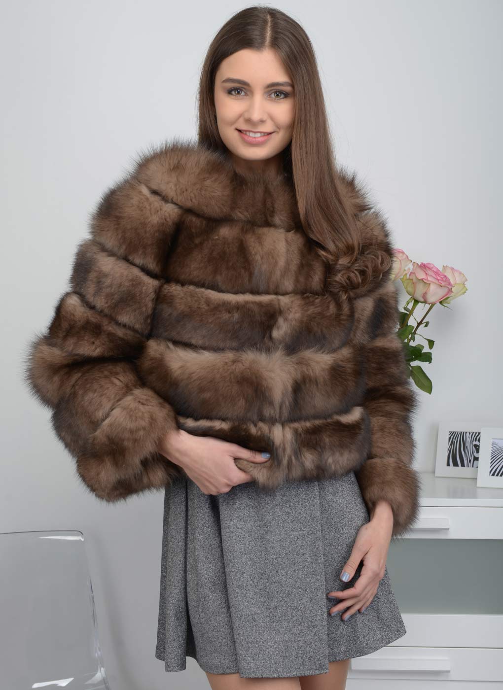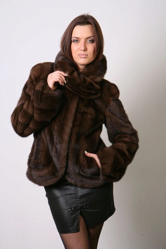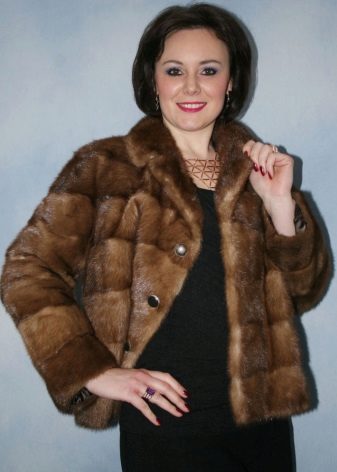 Mink coat shortened silhouette in brown tones - great for work. The length is slightly below the waist, the cut is absolutely free, flared sleeves, stand collar. All these elements make the image incredibly attractive, stylish and business. Although the style is quite simple.