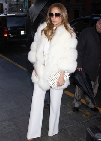 Business women under a fur coat can wear a pantsuit. The main thing is that the jacket or blouse should not be peeking from under the bottom.