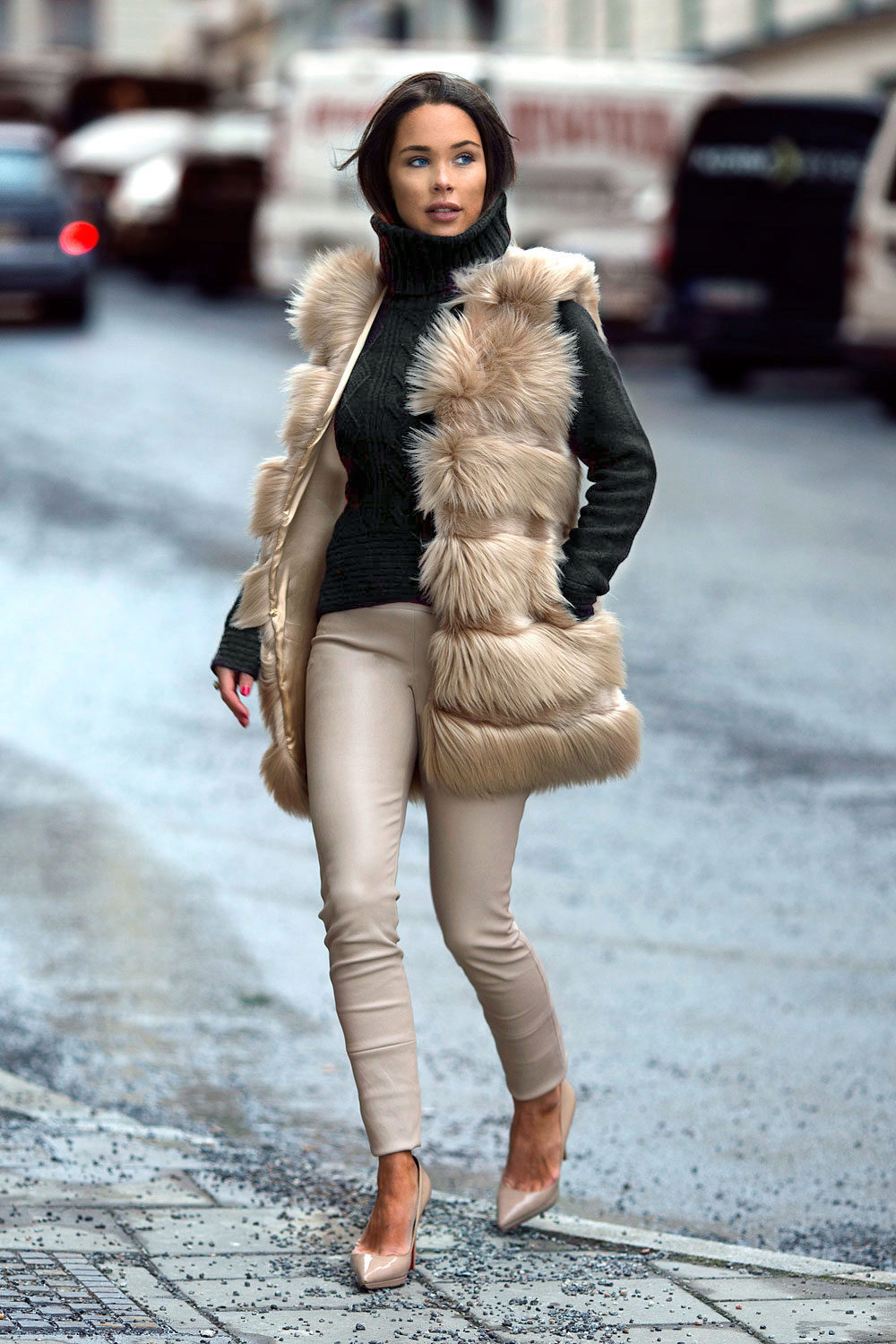 A beautiful, short-cut fur coat creates a trendy and elegant image of a modern car carrier.