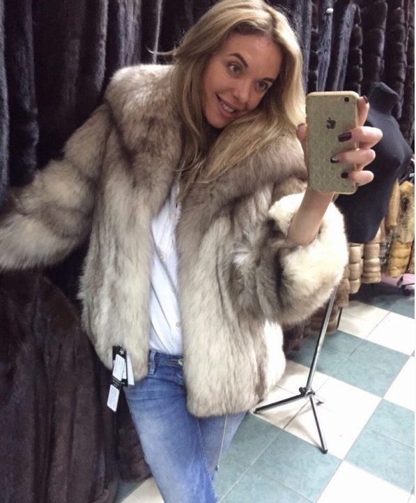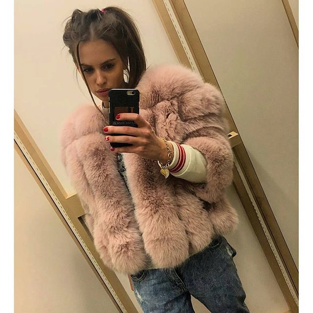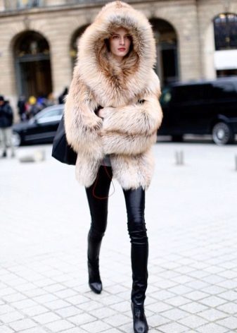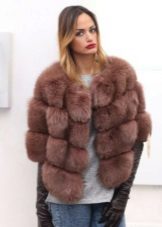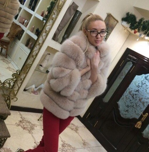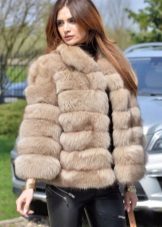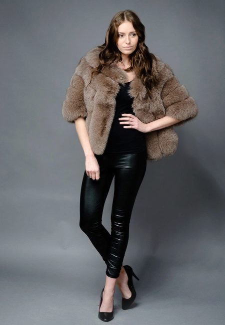 The short fox fur coat of light brown shade surprisingly harmonizes with the girl's hair color. An interesting model with a wide shortened sleeve of wide transverse fur stripes.Instead, the collar - a beautiful rounded neckline. Under the fur coat of the car avtoledi, clothes were successfully chosen: tight-fitting black pants made of leather and the same color jacket and shoes. The lack of jewelry is justified, since the focus is on luxury fur.