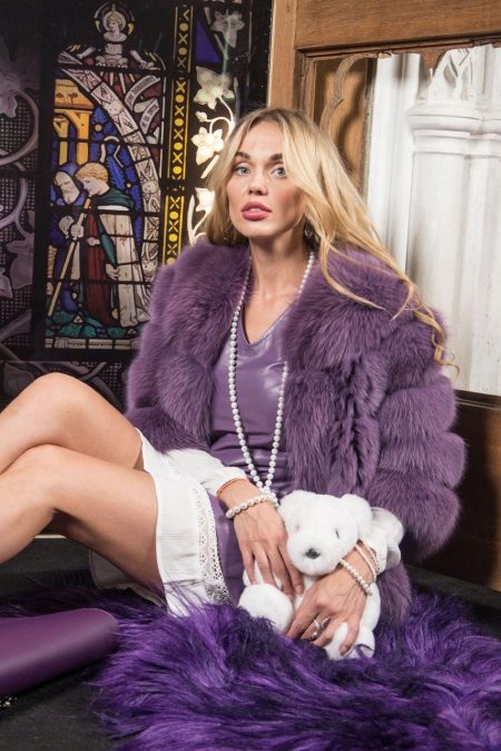 Similar in style to the model, but only having a more lush fur and trendy lilac colors. In this case, the dress under the skin is an appropriate addition, both in color and style. Pearl jewelry also refers to the cold color scheme, which in general creates a harmonious image of a dynamic avtoledi, which complements the cute bear and long fluffy hair.