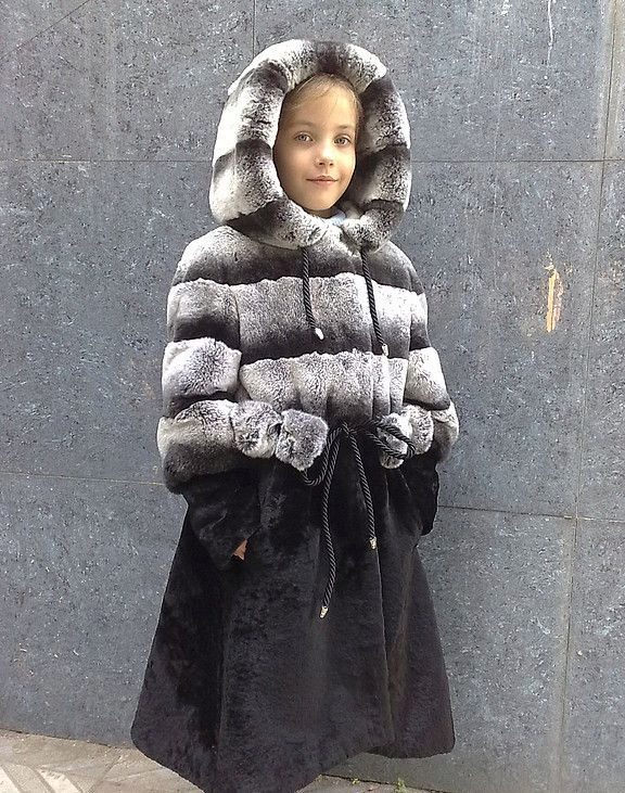 The universal model of rabbit-rex fur is suitable for both boys and girls. The unusual color scheme, the transverse cut and the spacious hood, which allows you to put on your baby’s favorite hat, also make this coat a real boon for parents, convinced that their child should not only be warm, but also look stylish.