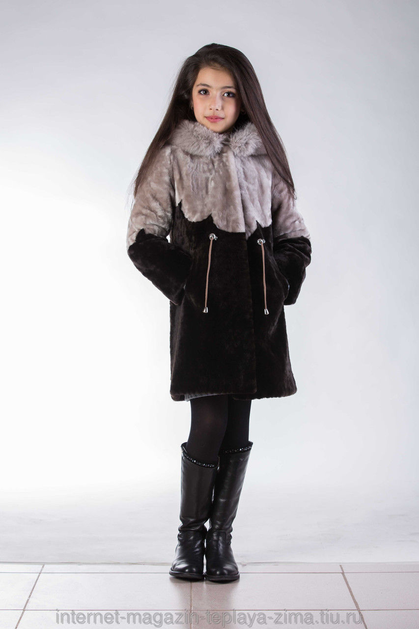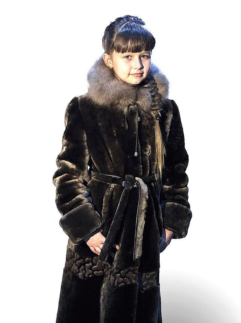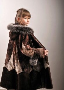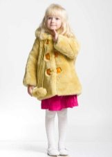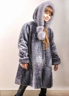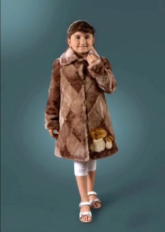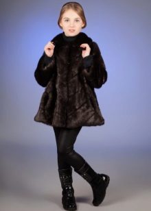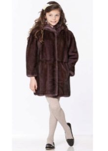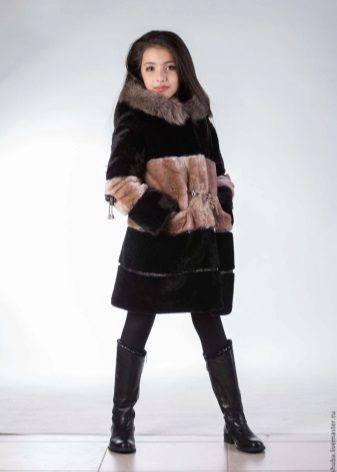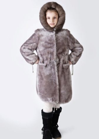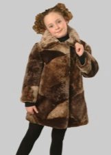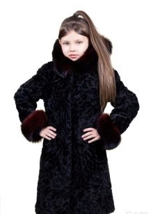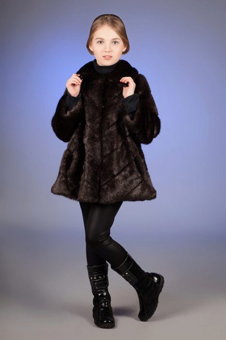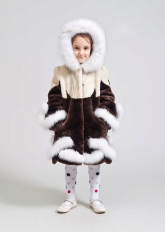 If a muton is chosen to create small fur coats, then most often models with a trapezoidal cut are obtained. Such clothes look great with a skirt, dress, it is not forbidden to also wear tight pants. The hem with a slight flare looks both elegant and practical. The hood is superfluous here, without it the coat will look more elegant. But a wide belt of contrasting skin would be more appropriate, moreover, if there is wind in the street, the child will not freeze.