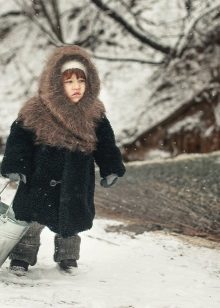 The hood in children's fur coats performs more warming function than decorative. An alternative to a volumetric hood, which is not always comfortable, is a fluffy collar, which is well protected from the wind. The sleeves should be long and fairly loose, sometimes they are made slightly flared. Very important is the clasp, which can be embodied in buttons or zippers, but not in secret hooks.