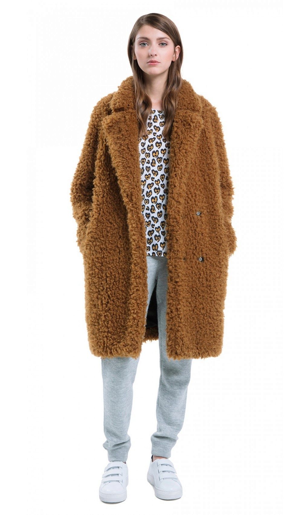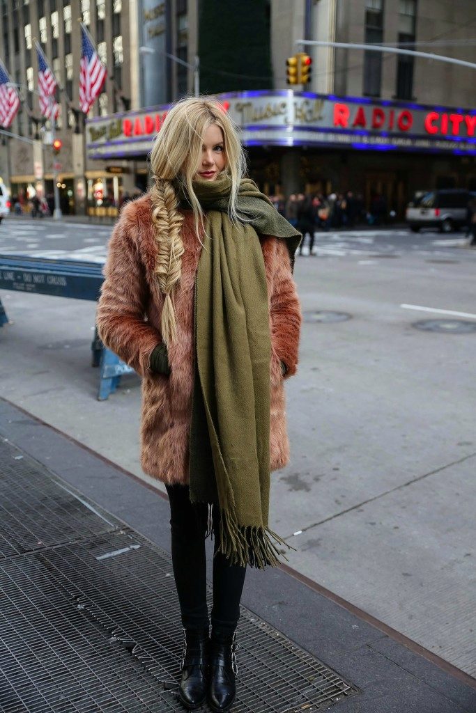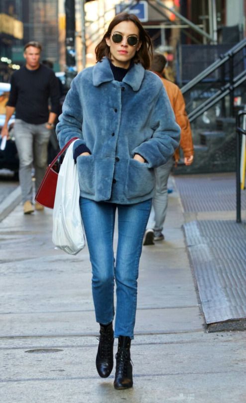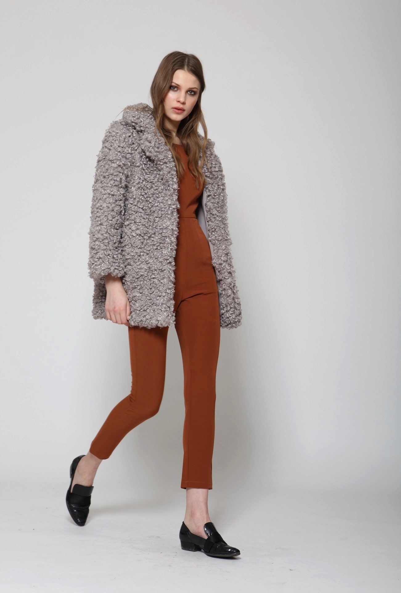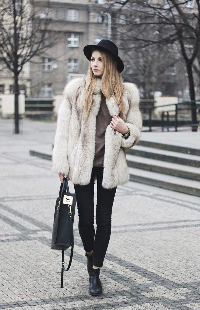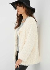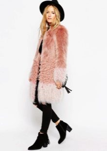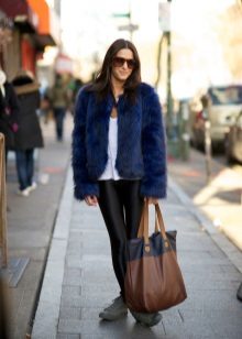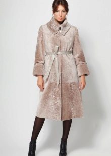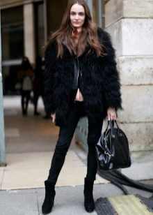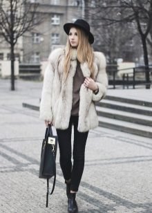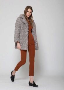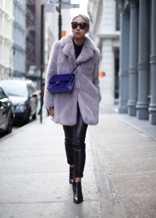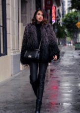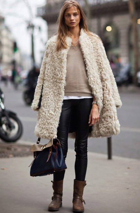 - A light elongated astrakhan fur coat is perfect for every day. You can wear it with comfortable casual clothes: a white T-shirt, casually looking out from under a beige sweater, black leather leggings and brown brutal boots. The image will add a bulk bag, you can additionally throw a warm scarf around your neck.