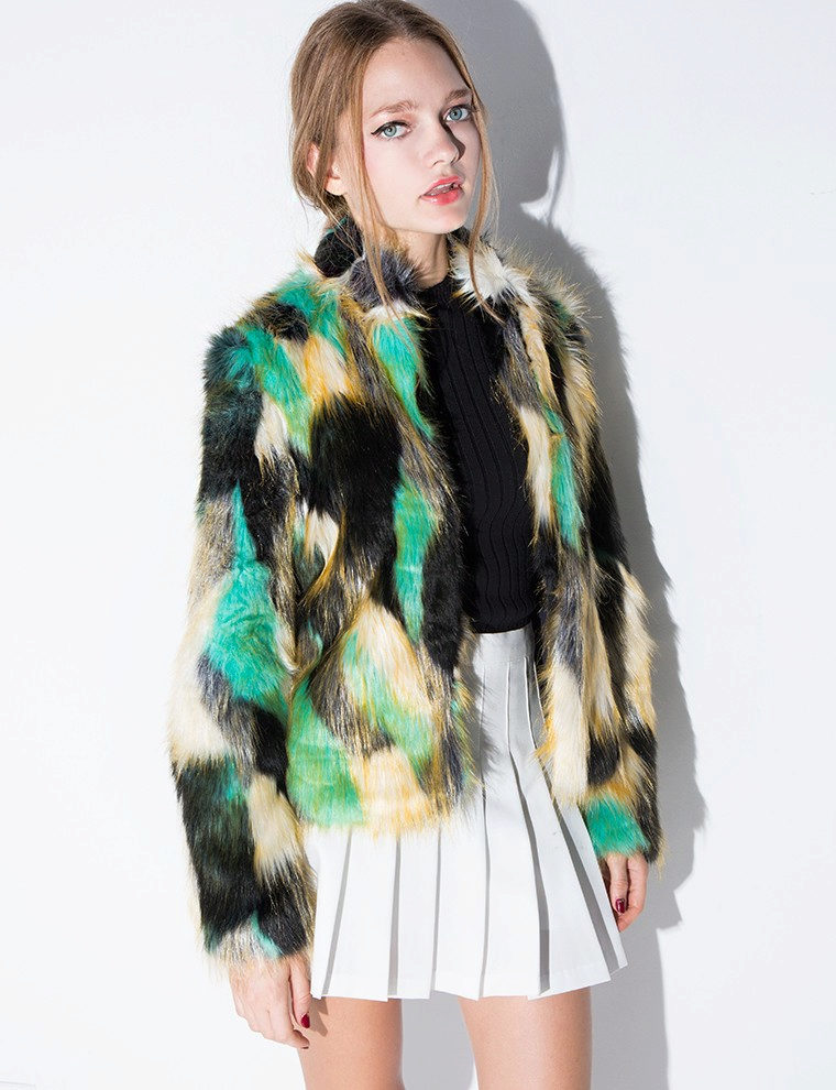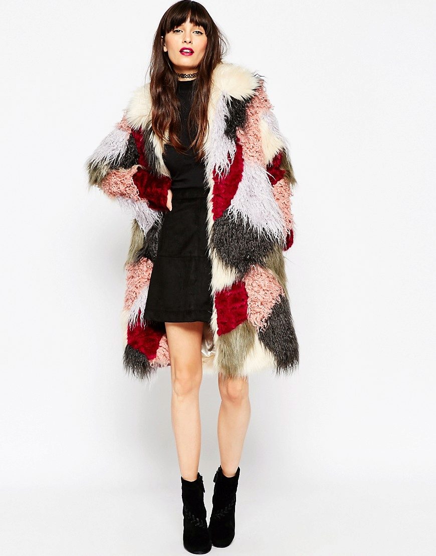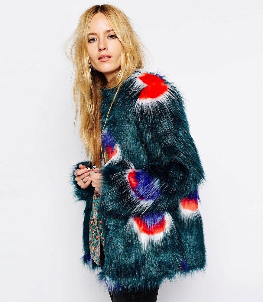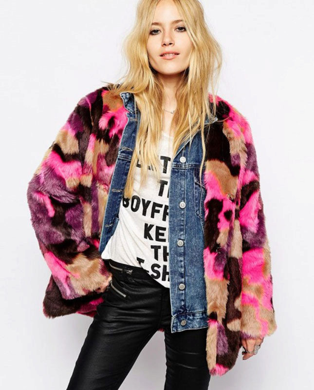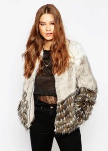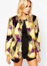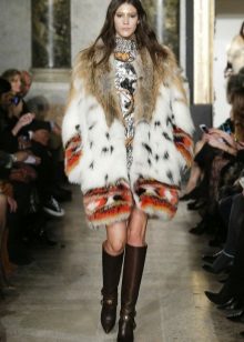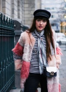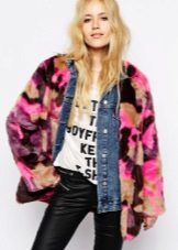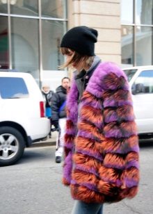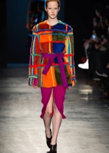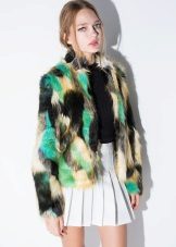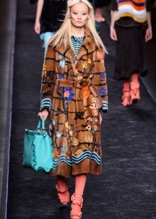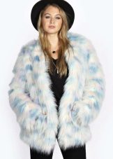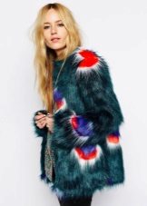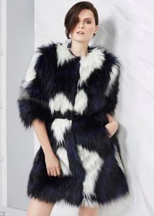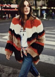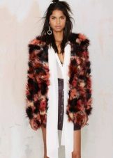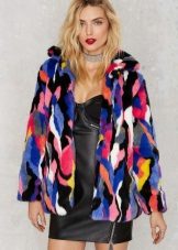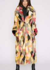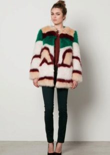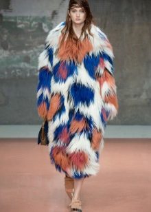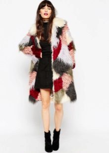 This year, fur coats assembled from multi-colored pieces of eco-fur are very popular. It can be a combination of white blue and pink, red, black and beige, white, red and turquoise. Great variety of options!