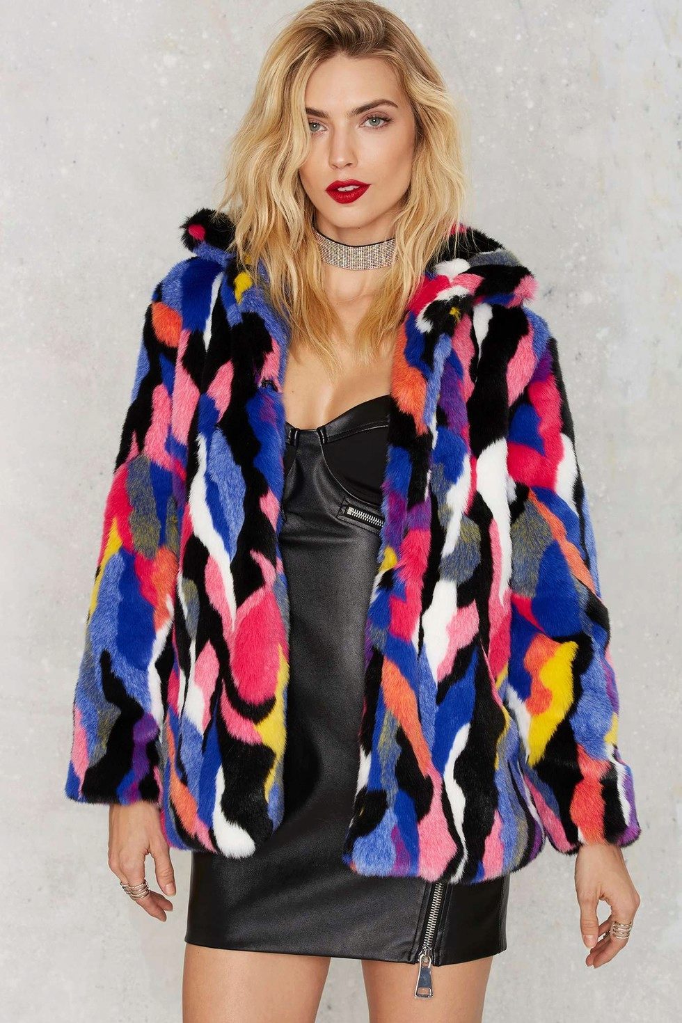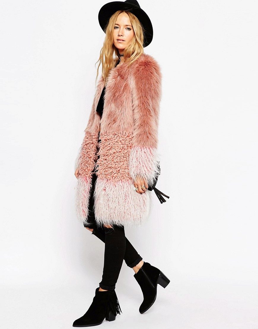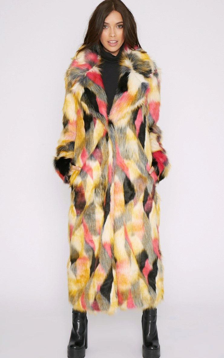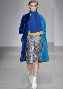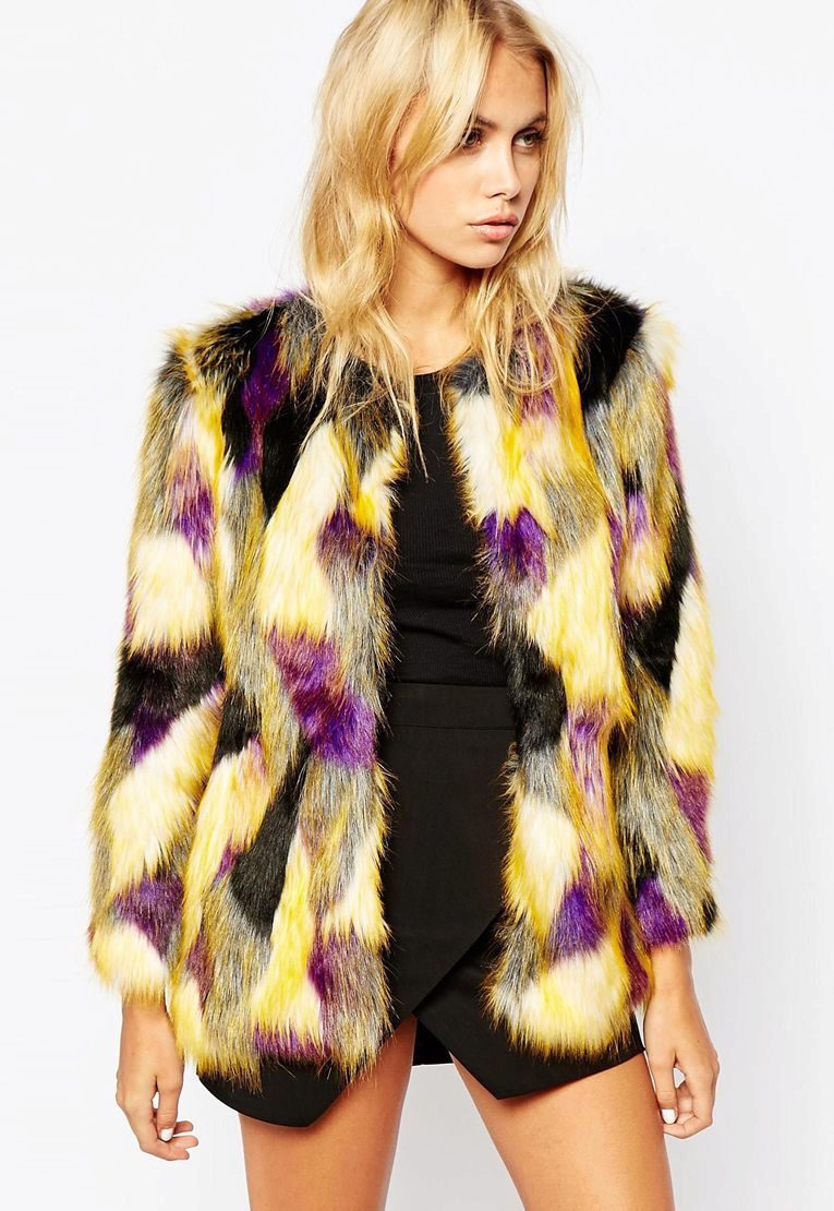 This year, fur coats assembled from multi-colored pieces of eco-fur are very popular. It can be a combination of white blue and pink, red, black and beige, white, red and turquoise. Great variety of options!
