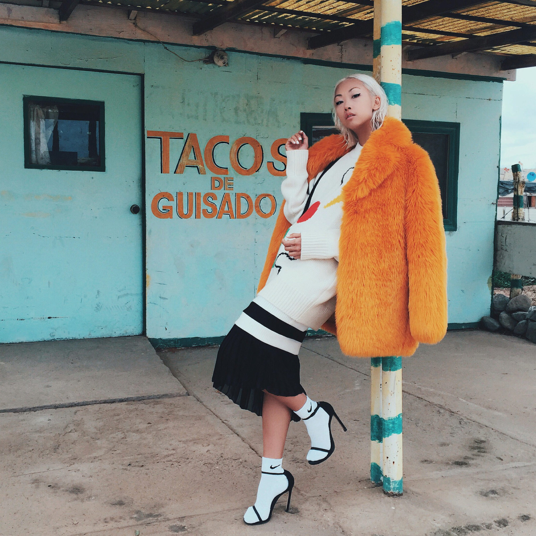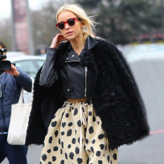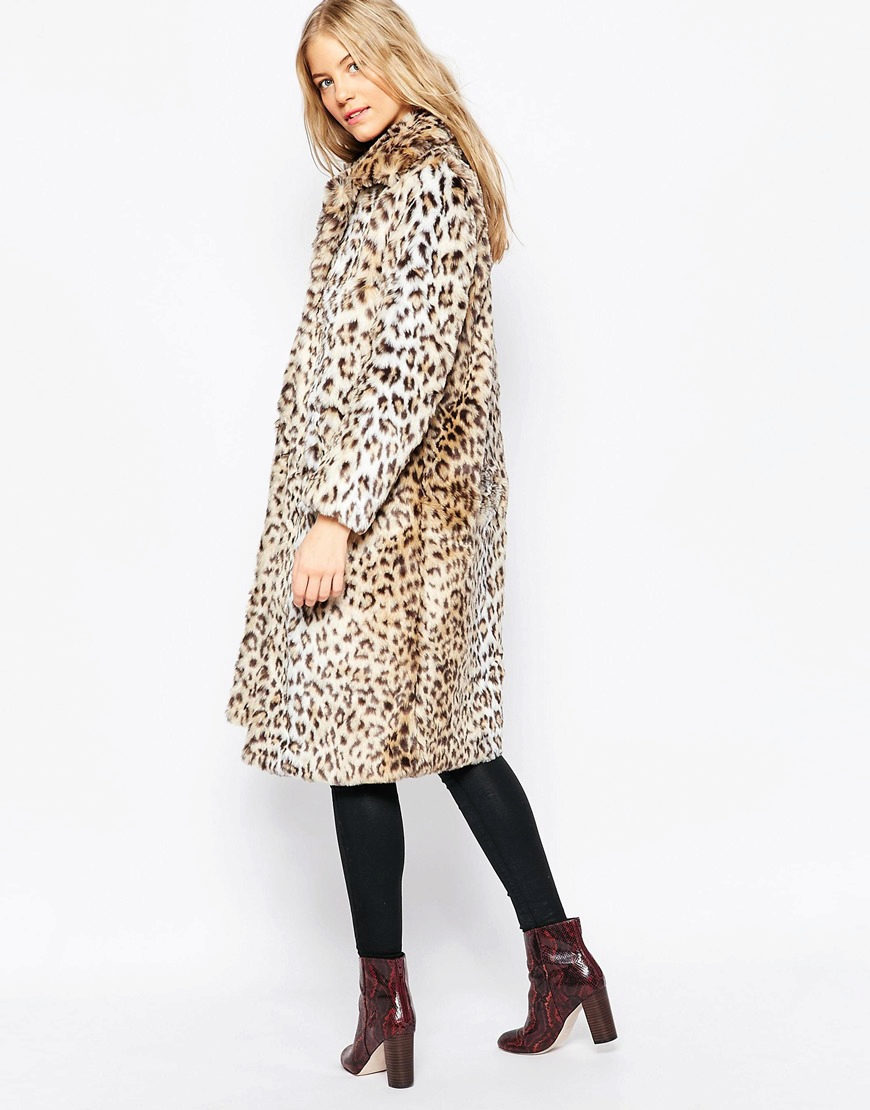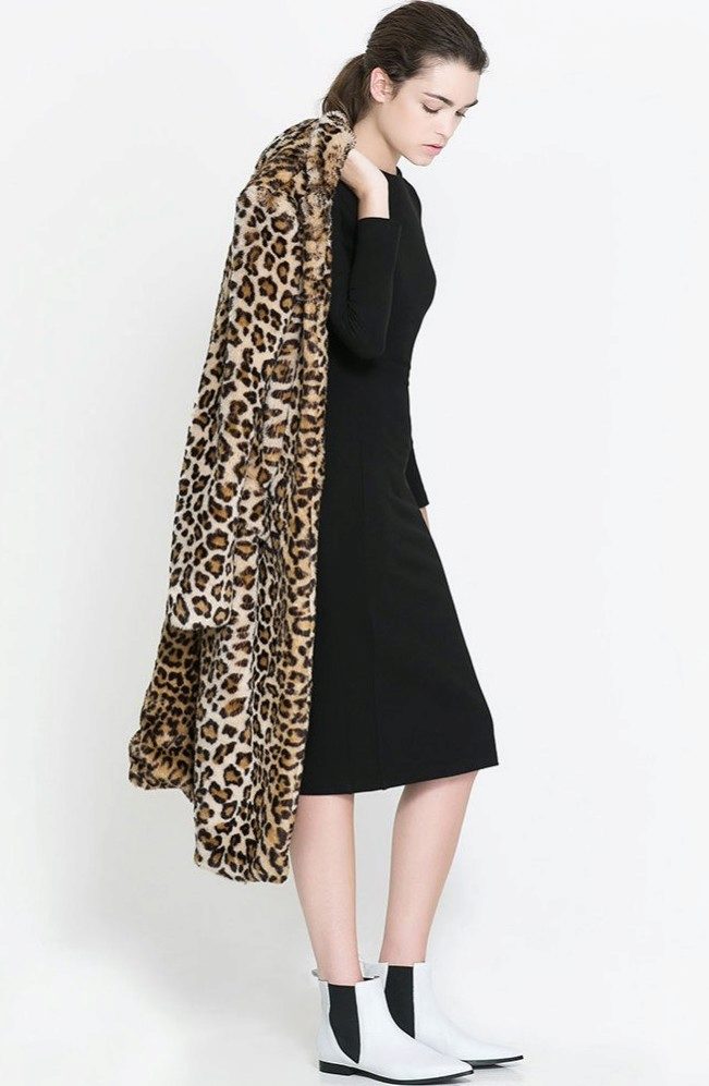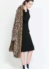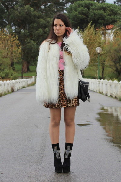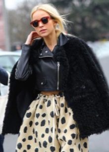 - A stylish look for an incendiary party! Pink t-shirt, leopard mini-skirt, black high-heeled ankle boots and a white volky fur coat with a long thick pile that won't let you freeze. The image is complemented by a black handbag on a long strap. This look is suitable for self-confident girls who are not afraid to be in the center of attention.