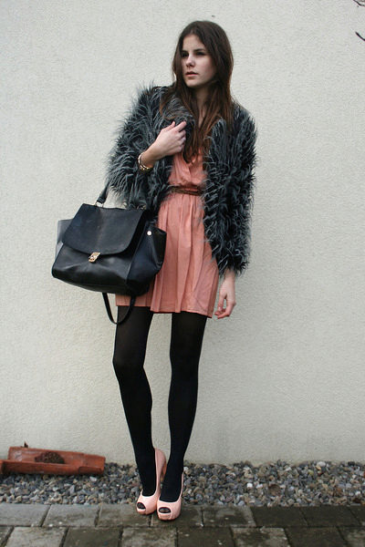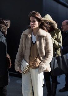 - Go on a date? Then you can not do without a shortened fur coat, which will complement your romantic image. Light cream dress and shoes in tone will give the image of femininity and tenderness. Thick black tights will not let you freeze. The image will add a voluminous black handbag, which can be easily replaced with a small clutch.