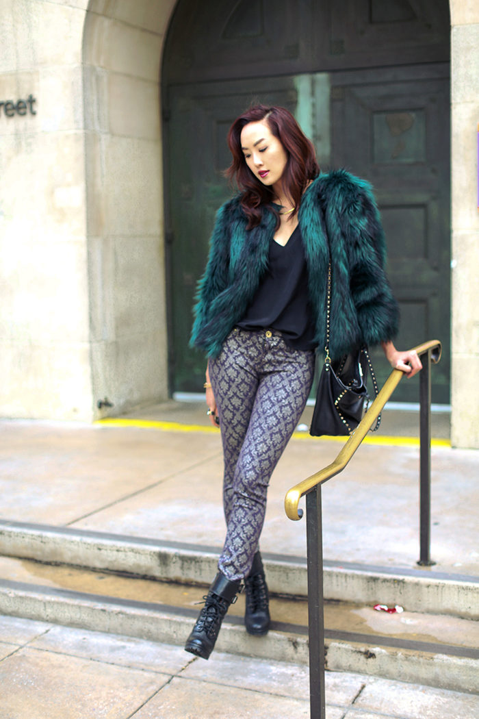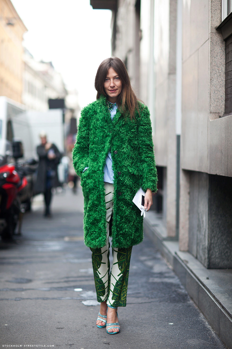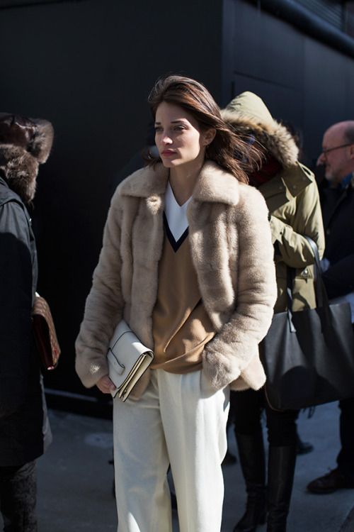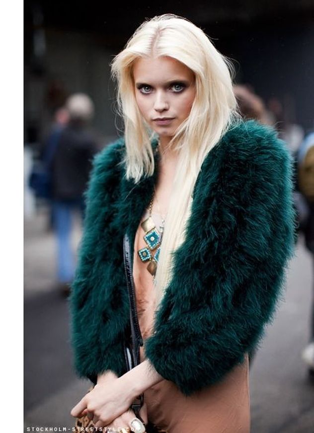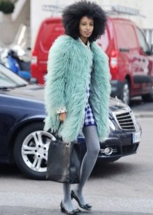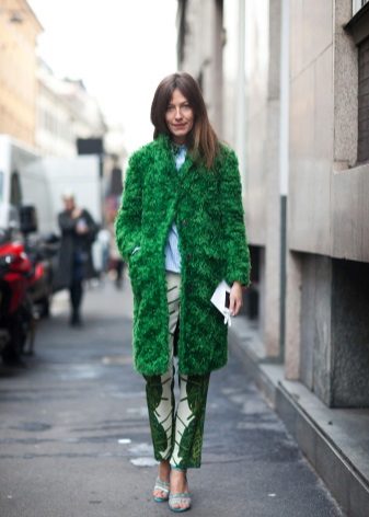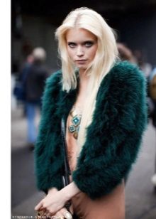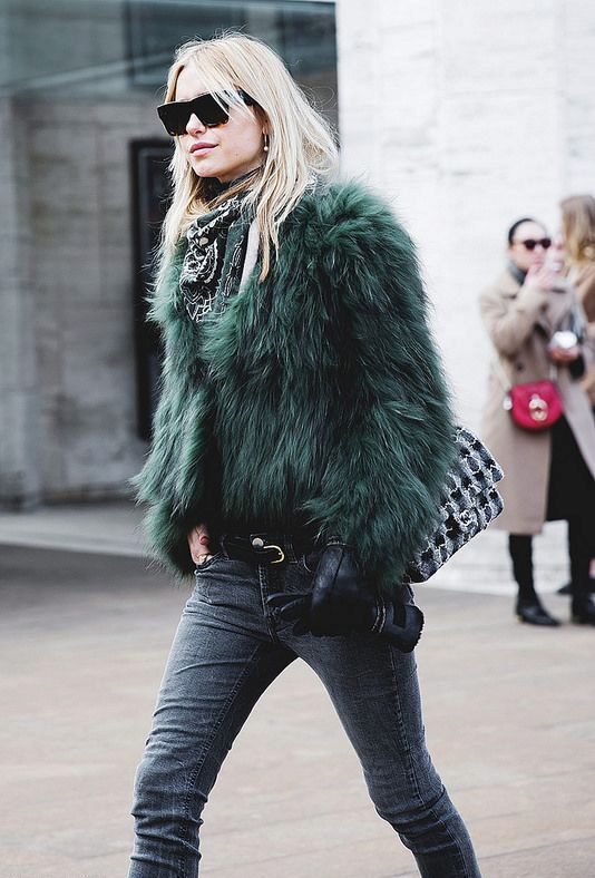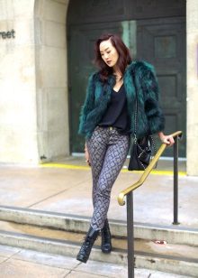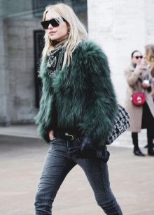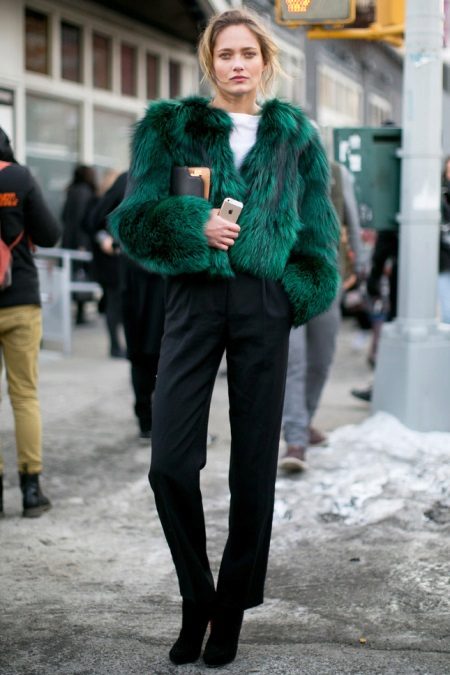 - The emerald-colored cropped fur coat looks incredibly luxurious! It serves as a highlight of the image, so it is better to combine it with the basic clothes of the wardrobe, like this. White slim jumper, black skinny pants and black ankle boots. The image is complemented by a small clutch and a careless hairstyle. Very elegant and stylish.