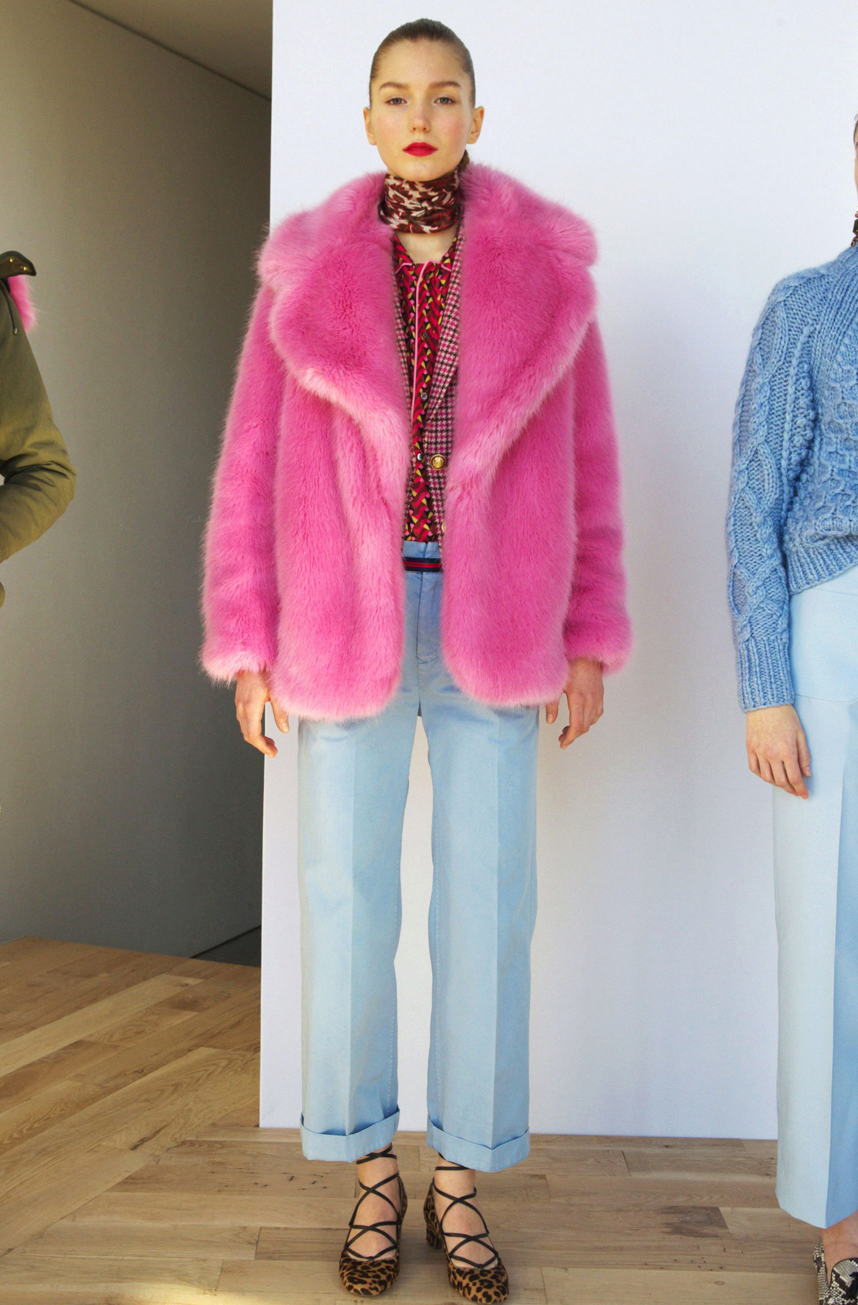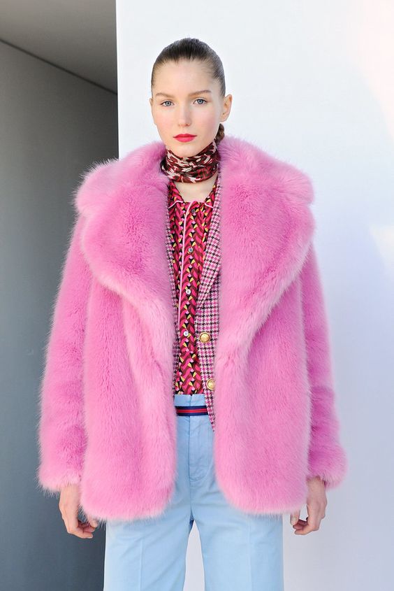 Bright monophonic coats of blue, pink, and lilac are also popular. They will appeal to brave girls who want to be the center of attention.