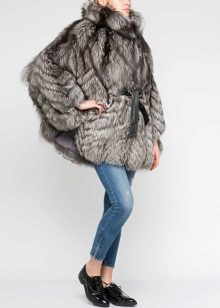 The youthful, eye-catching look - a two-tone fur coat made from the fur of a beaver is trimmed with a fluffy arctic fox collar in perfect harmony with jeans, which are distinguished by designer wear and zippers on ankles. Black patent leather shoes, shod on bare feet, add lightness and elegant carelessness to the image.